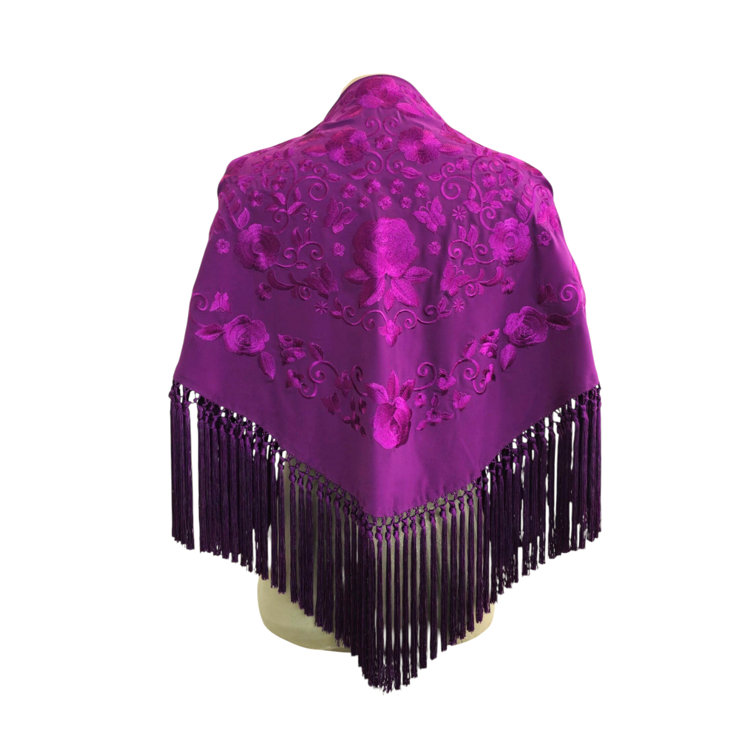 Precioso mantoncillo confeccionado en crespón de seda, un tejido suave y muy cómodo de llevar. Color berenjena, bordado a tono y flecado a mano. Ideal para cualquier romería o feria. *Según el dispositivo desde el que estés visualizando nuestra web, los colores pueden verse ligeramente alterados*.