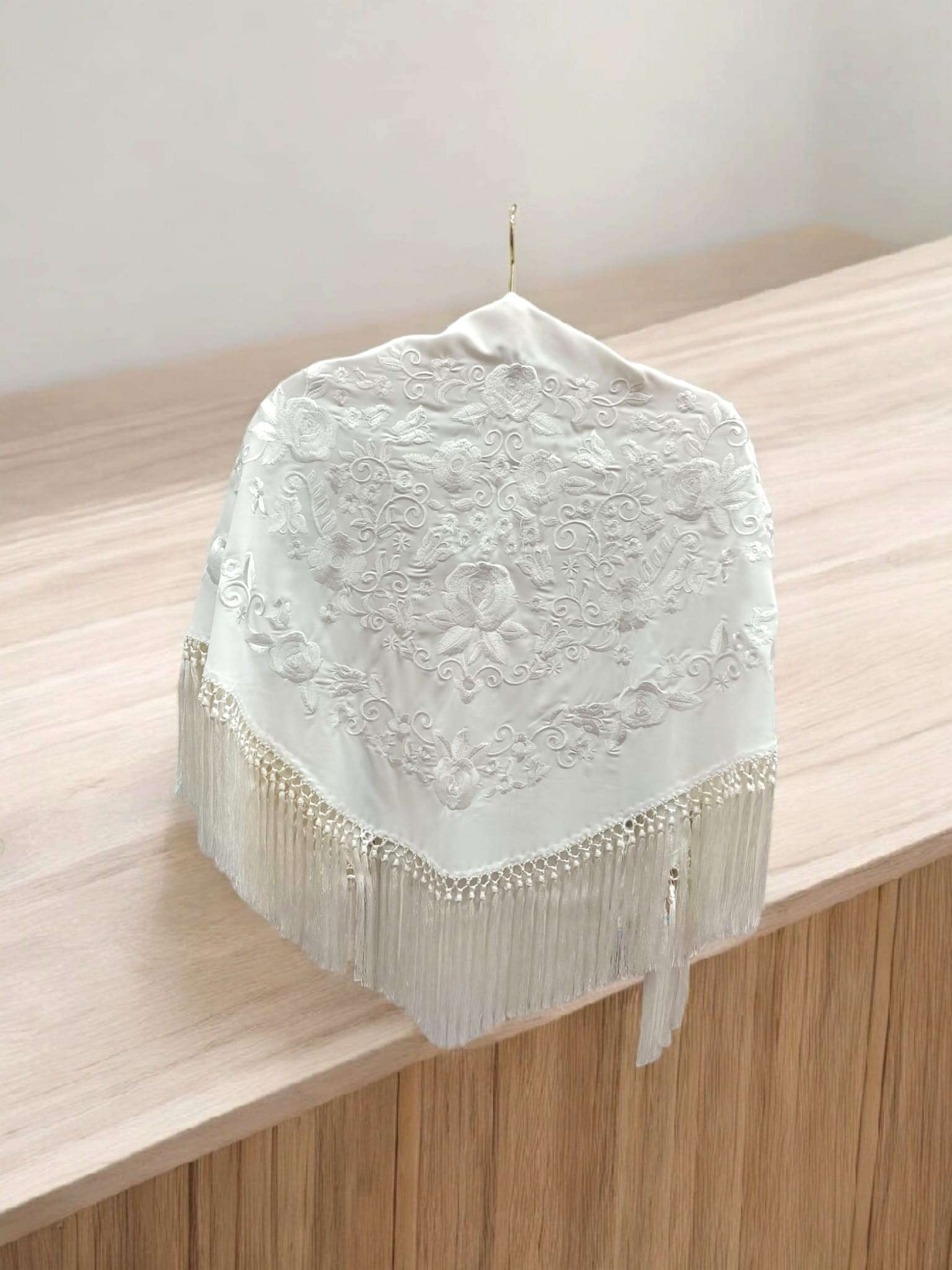 Precioso mantoncillo confeccionado en crespón de seda, un tejido suave y muy cómodo de llevar. Color blanco perla, bordado a tono y flecado a mano. Ideal para cualquier romería o feria. *Según el dispositivo desde el que estés visualizando nuestra web, los colores pueden verse ligeramente alterados*.