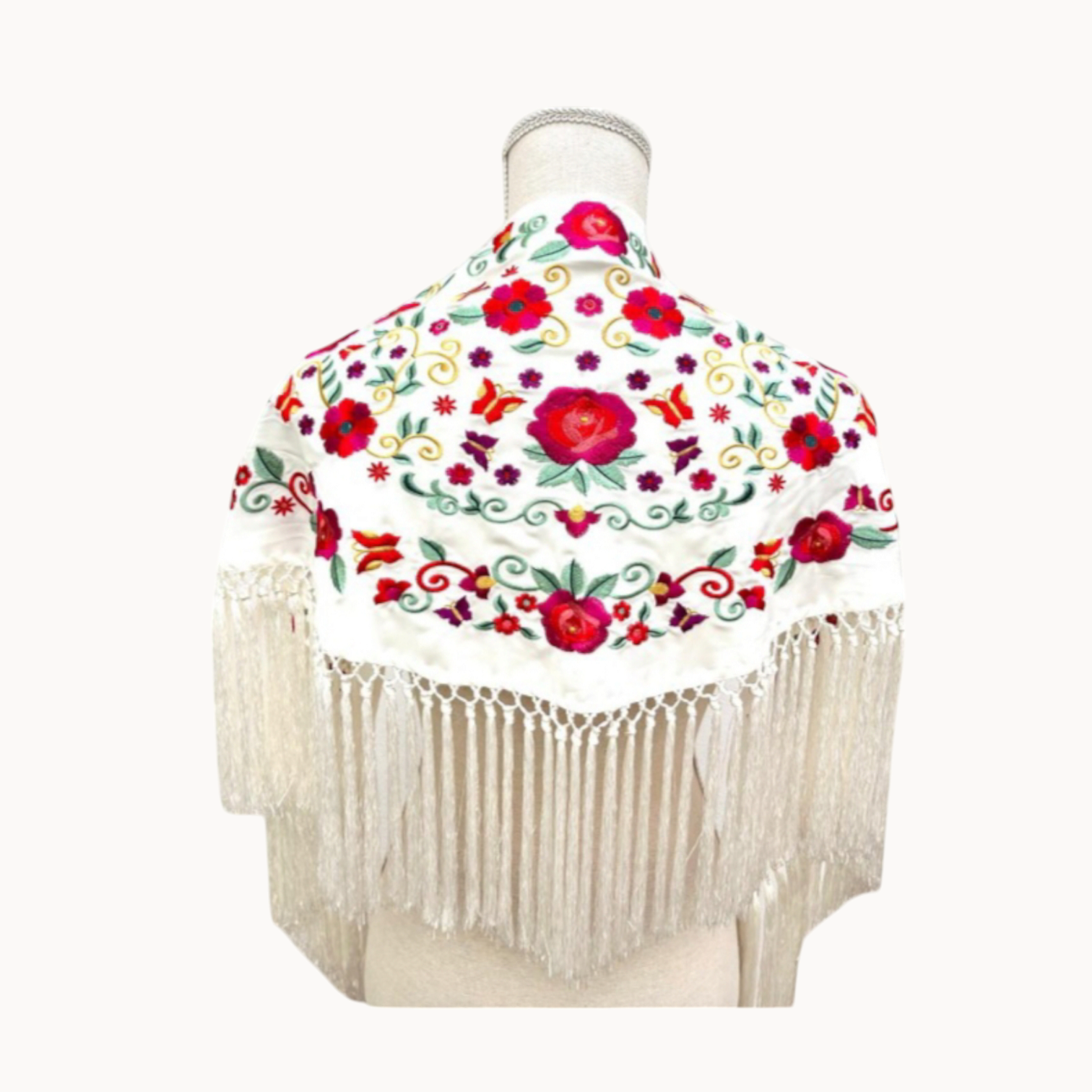 Precioso mantoncillo confeccionado en crespón de seda, un tejido suave y muy cómodo de llevar. Color blanco, bordado de colores y flecado a mano. Ideal para cualquier romería o feria. *Según el dispositivo desde el que estés visualizando nuestra web, los colores pueden verse ligeramente alterados*.