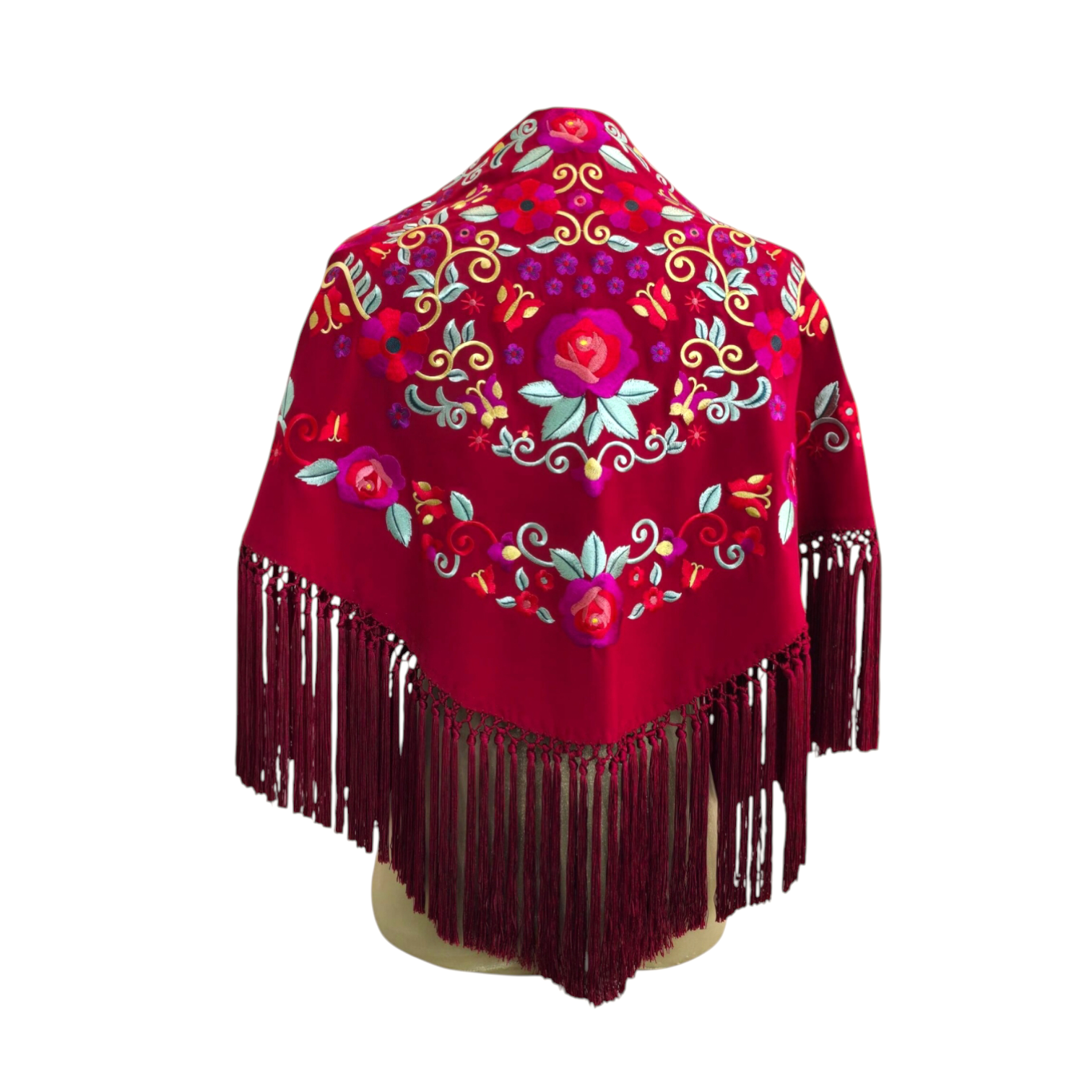 Precioso mantoncillo confeccionado en crespón de seda, un tejido suave y muy cómodo de llevar. Color burdeos, bordado de colores y flecado a mano. Ideal para cualquier romería o feria. *Según el dispositivo desde el que estés visualizando nuestra web, los colores pueden verse ligeramente alterados*.