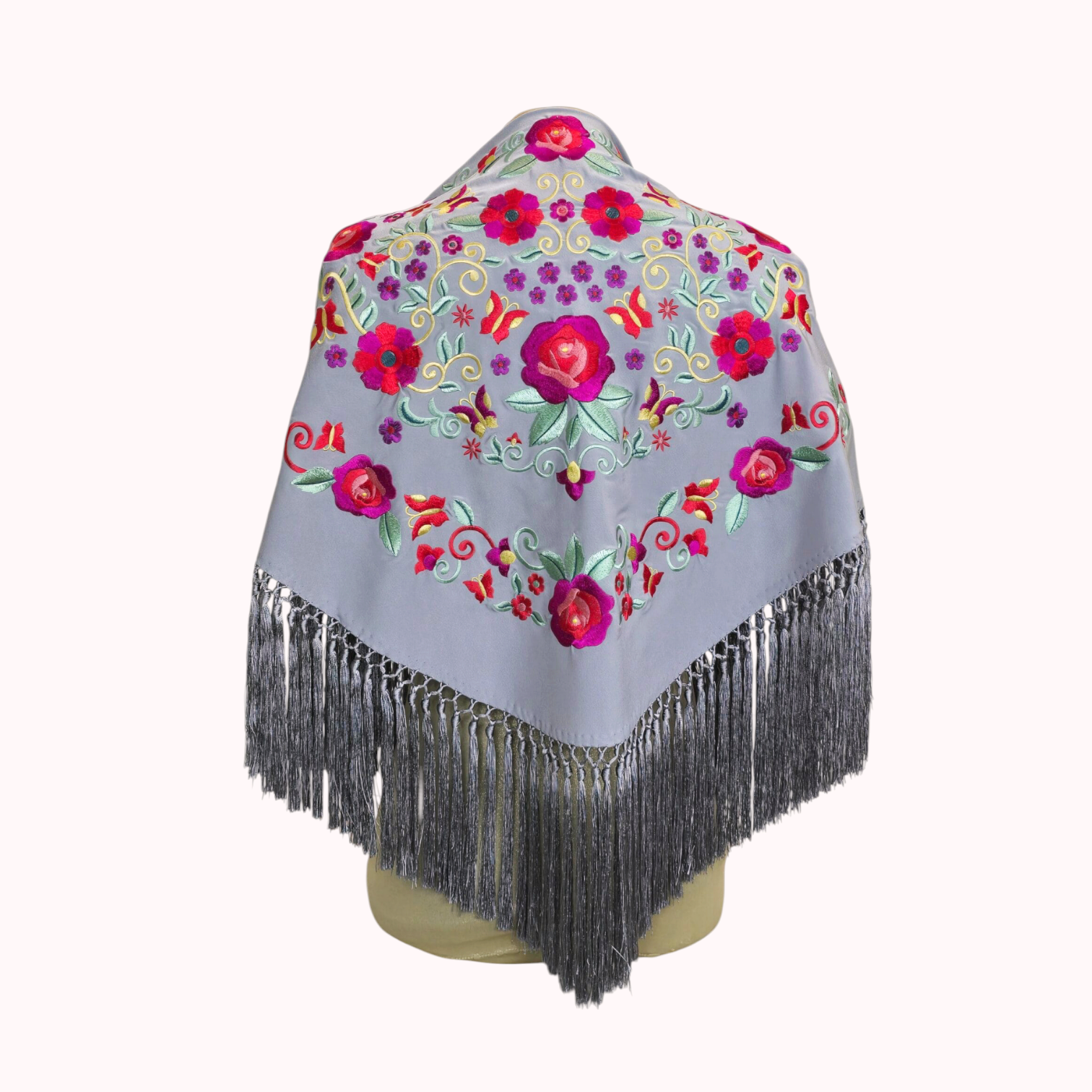 Precioso mantoncillo confeccionado en crespón de seda, un tejido suave y muy cómodo de llevar. Color gris, bordado de colores y flecado a mano. Ideal para cualquier romería o feria. *Según el dispositivo desde el que estés visualizando nuestra web, los colores pueden verse ligeramente alterados*.