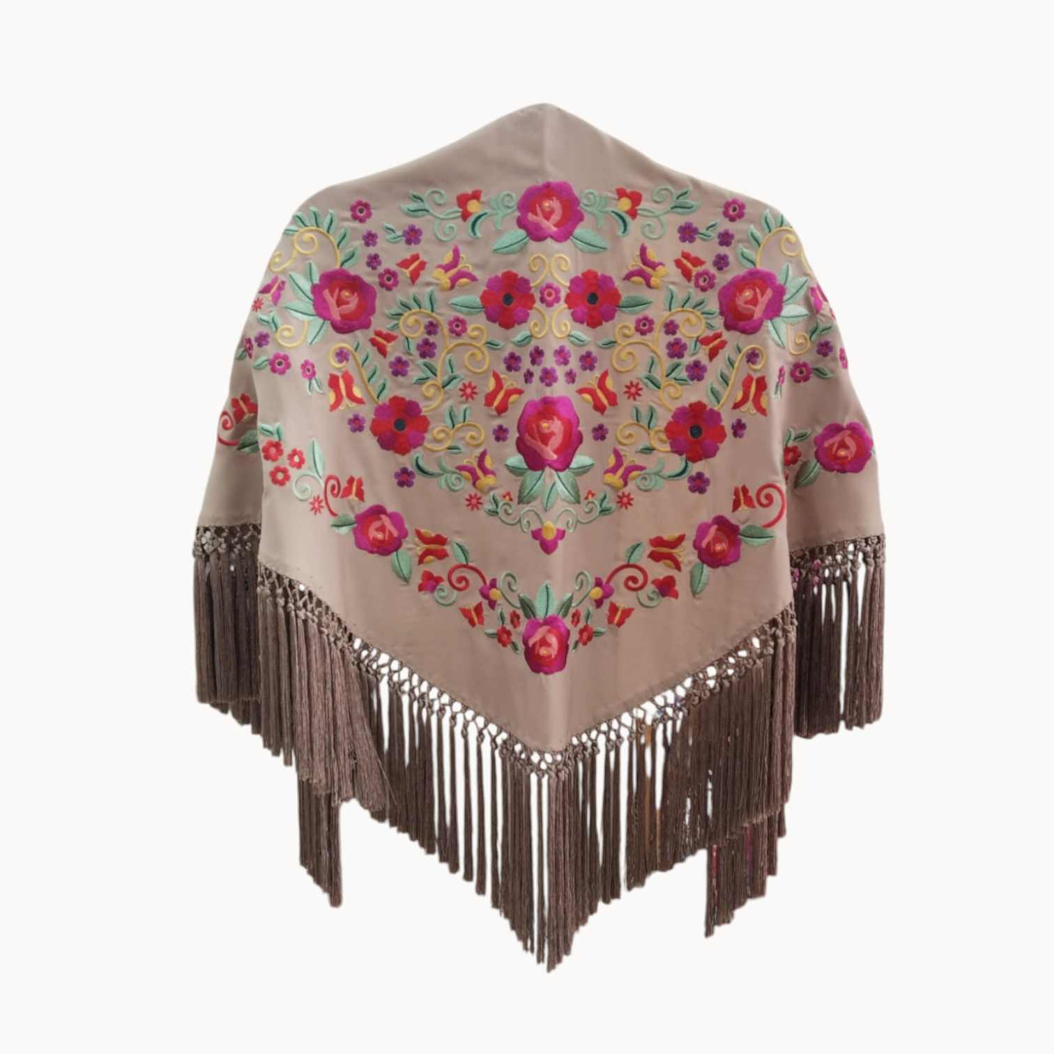 Precioso mantoncillo confeccionado en crespón de seda, un tejido suave y muy cómodo de llevar. Color marrón tierra clarito, bordado de colores y flecado a mano. Ideal para cualquier romería o feria. *Según el dispositivo desde el que estés visualizando nuestra web, los colores pueden verse ligeramente alterados*.