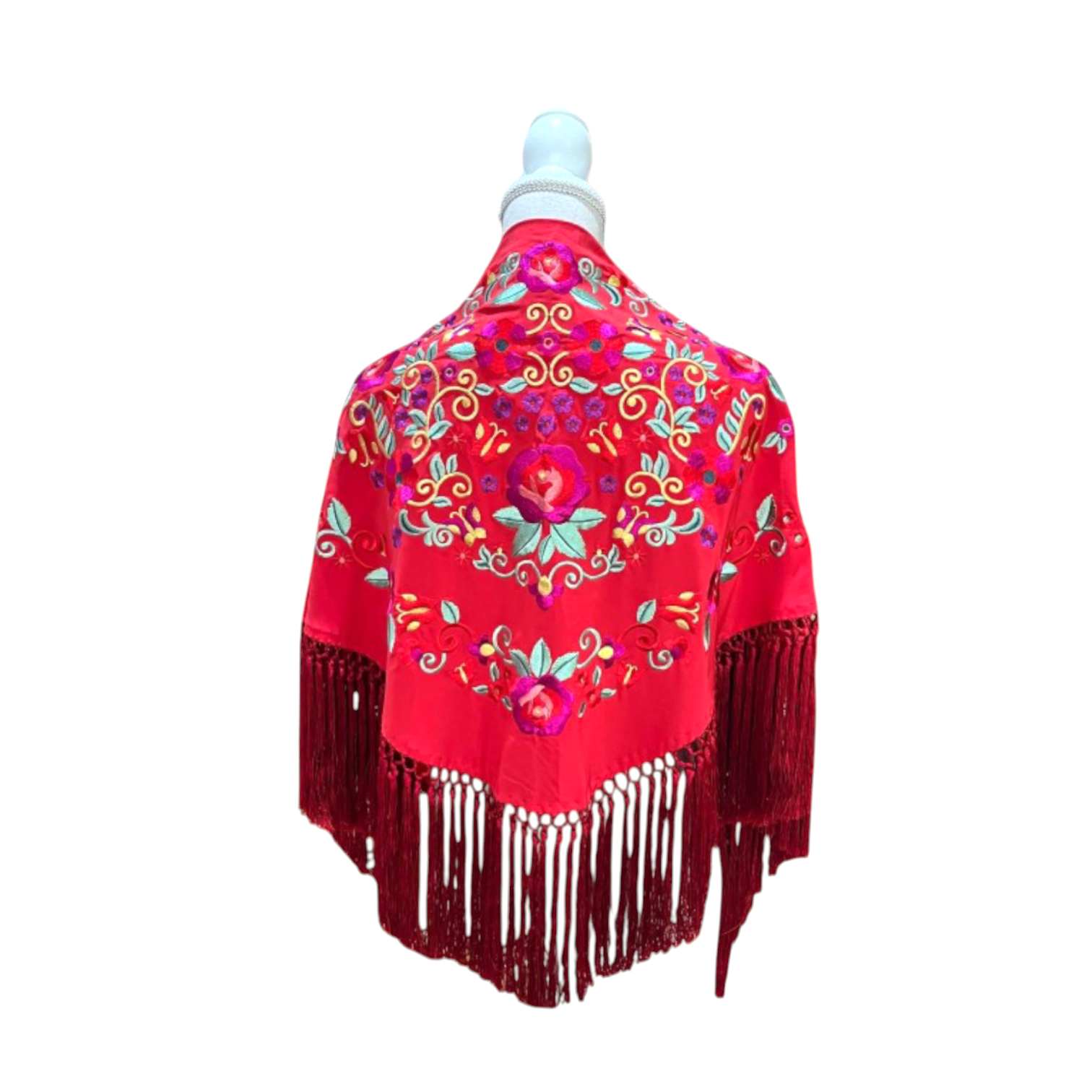 Precioso mantoncillo confeccionado en crespón de seda, un tejido suave y muy cómodo de llevar. Color rojo, bordado de colores y flecado a mano. Ideal para cualquier romería o feria. *Según el dispositivo desde el que estés visualizando nuestra web, los colores pueden verse ligeramente alterados*.