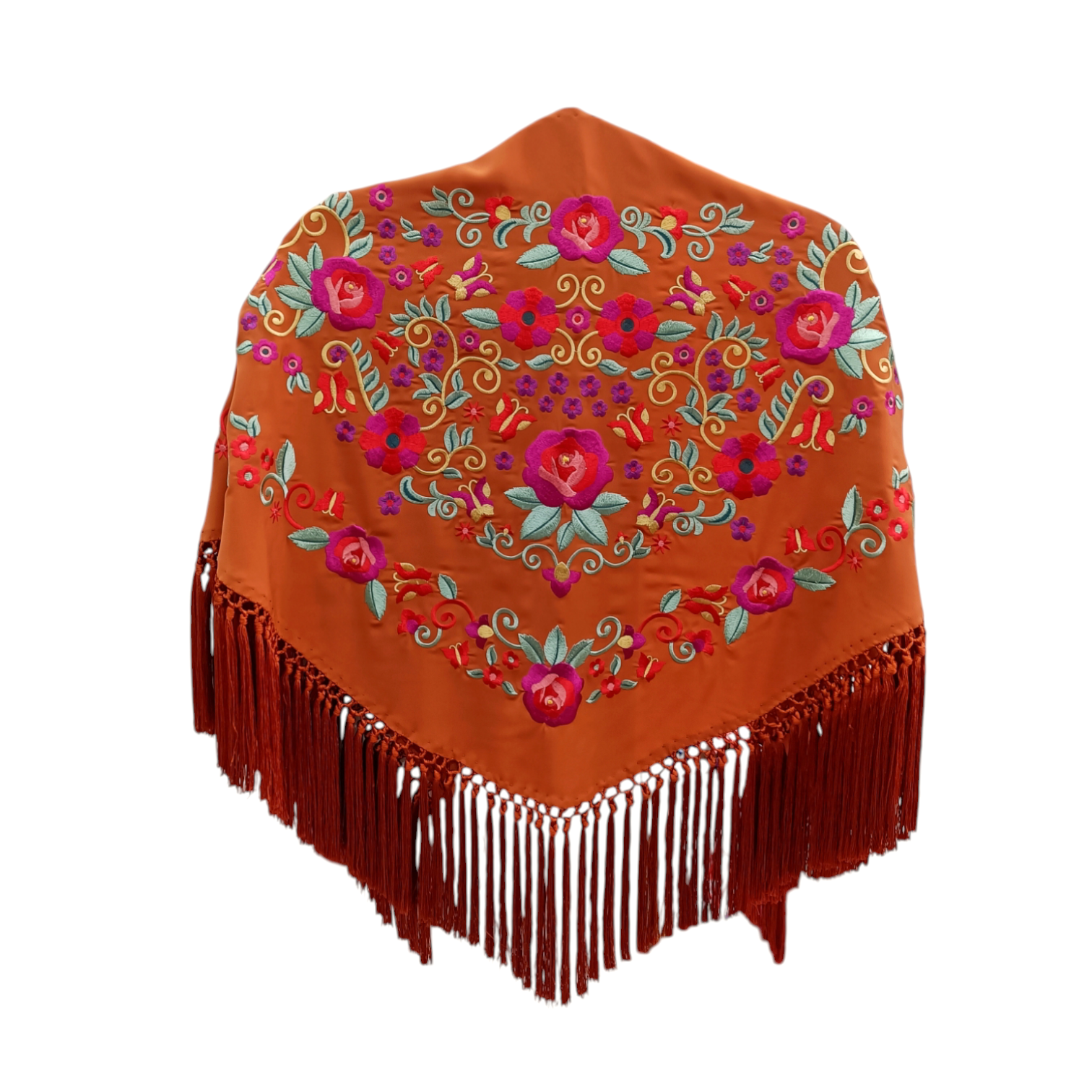 Precioso mantoncillo confeccionado en crespón de seda, un tejido suave y muy cómodo de llevar. Color teja, bordado de colores y flecado a mano. Ideal para cualquier romería o feria. *Según el dispositivo desde el que estés visualizando nuestra web, los colores pueden verse ligeramente alterados*.