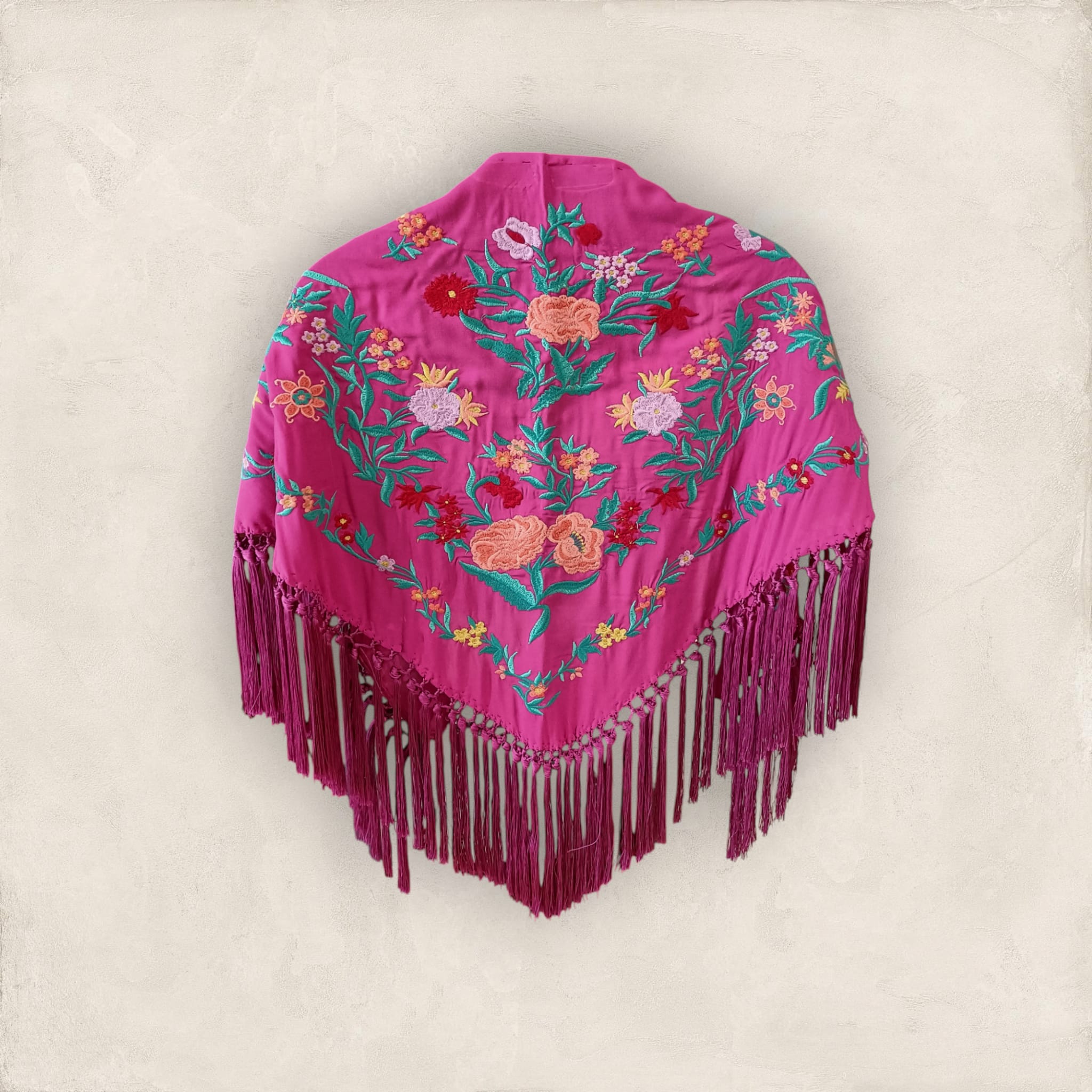 Precioso mantoncillo artesanal confeccionado en tejido de algodón y viscosa de alta calidad. Color buganvilla, bordado en color coral con hilo de seda y enrejado a mano con hilos de seda. Tacto suave y agradable. La elección perfecta para realzar tu look.