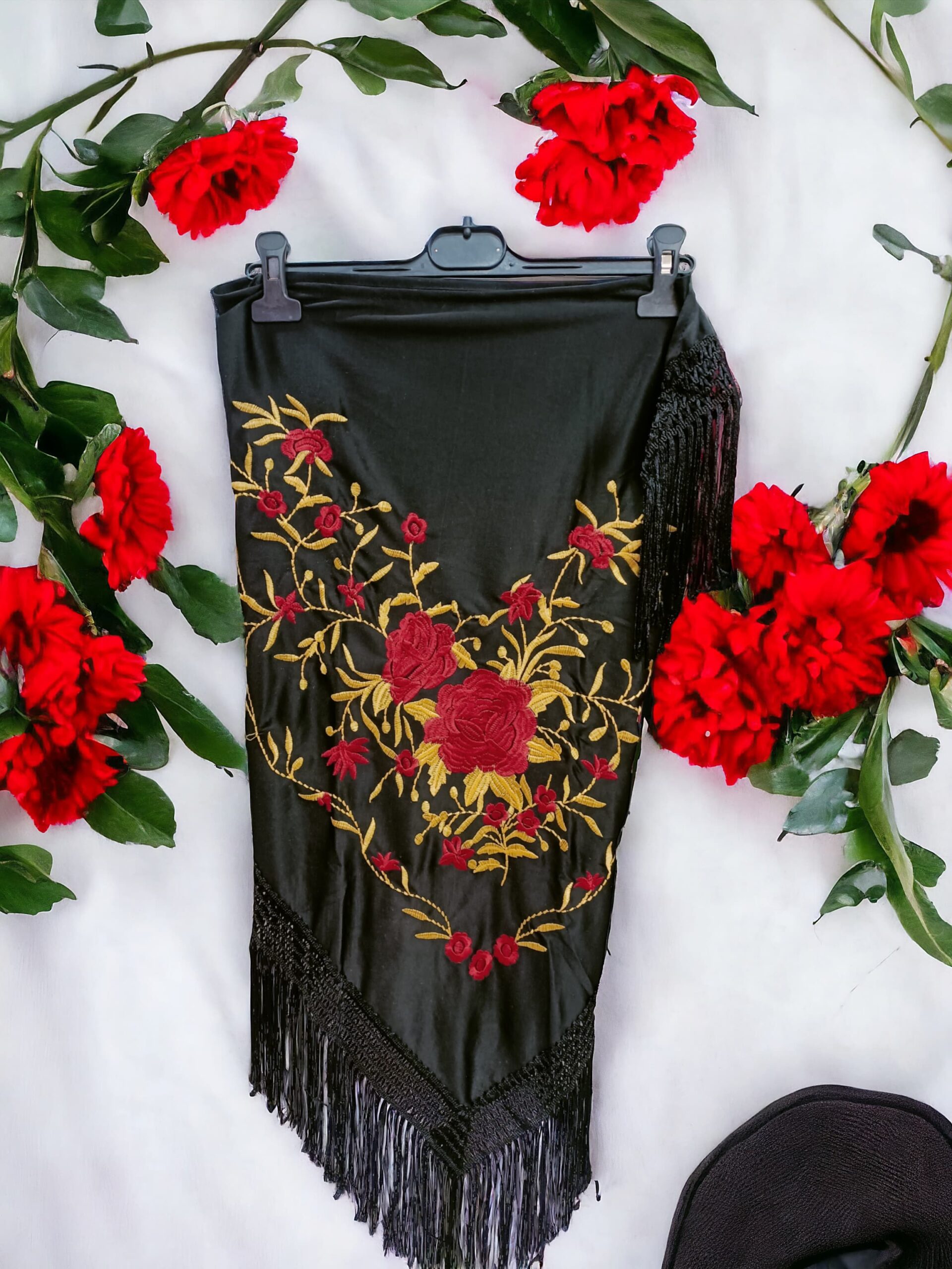 Mantoncillo Negro Bordado Ramillete Rojo y Dorado