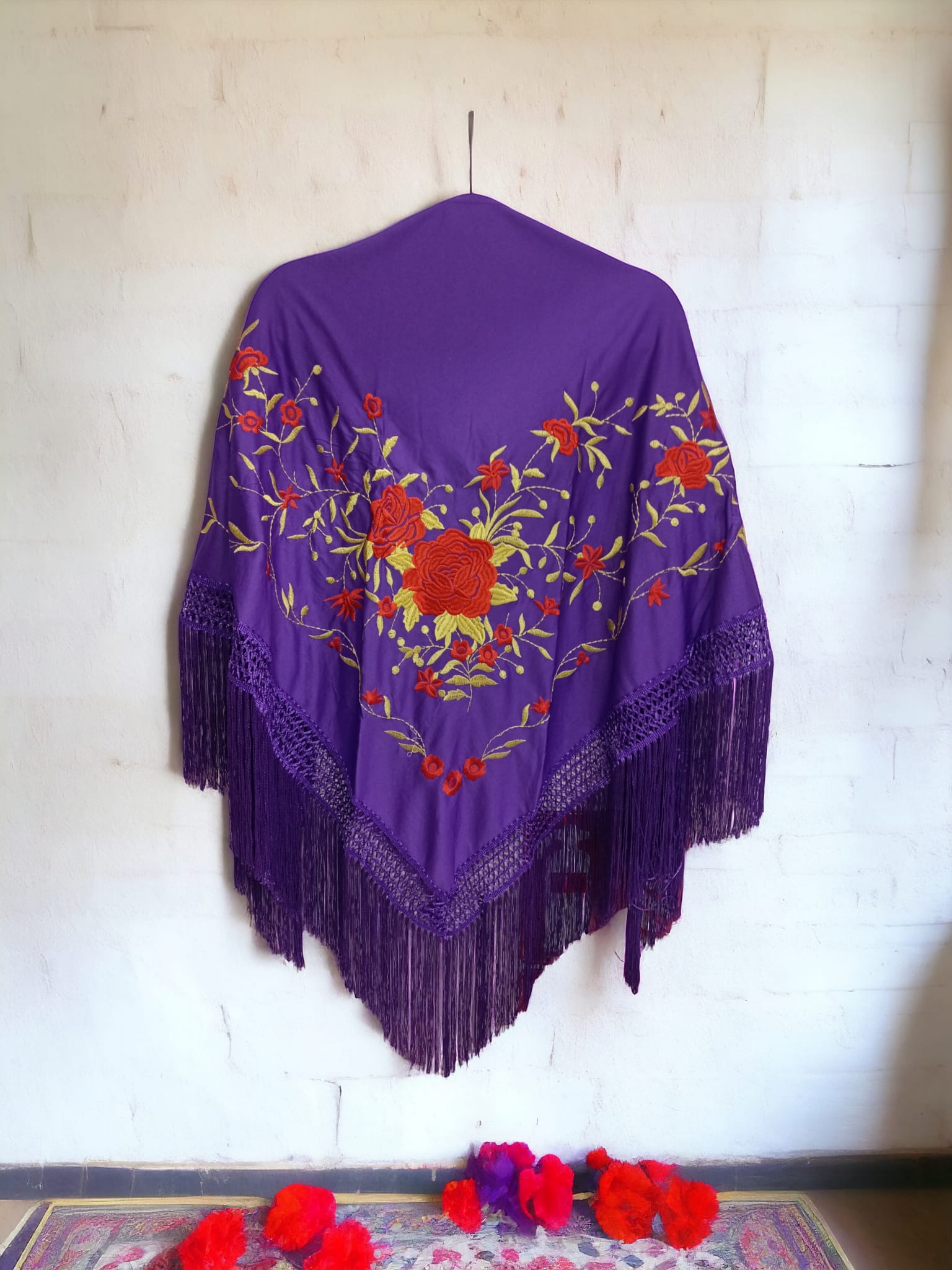 Mantoncillo de pico low cost. Color negro con bordado en color rojo y dorado. Ideal para lucirlo de todas las formas con tu traje o bata flamenca: clásico, cruzado… (La foto del mantón morado es solo para ver el diseño completo).