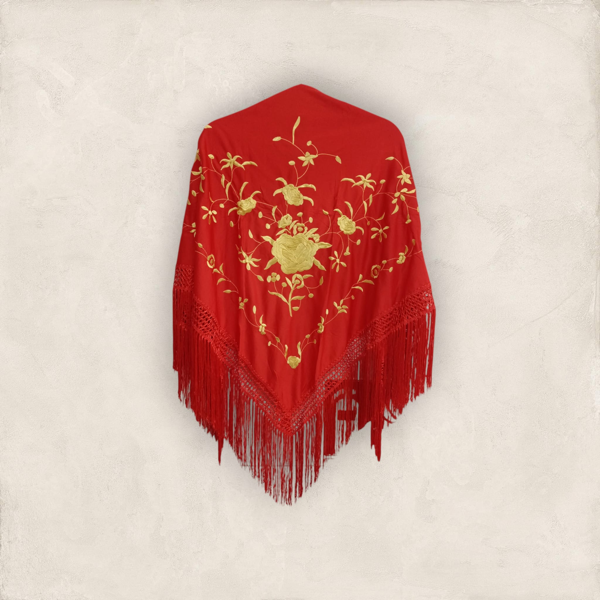 Mantoncillo de pico low cost. Color rojo con bordado en dorado. Ideal para lucirlo de todas las formas con tu traje o bata flamenca: clásico, cruzado…