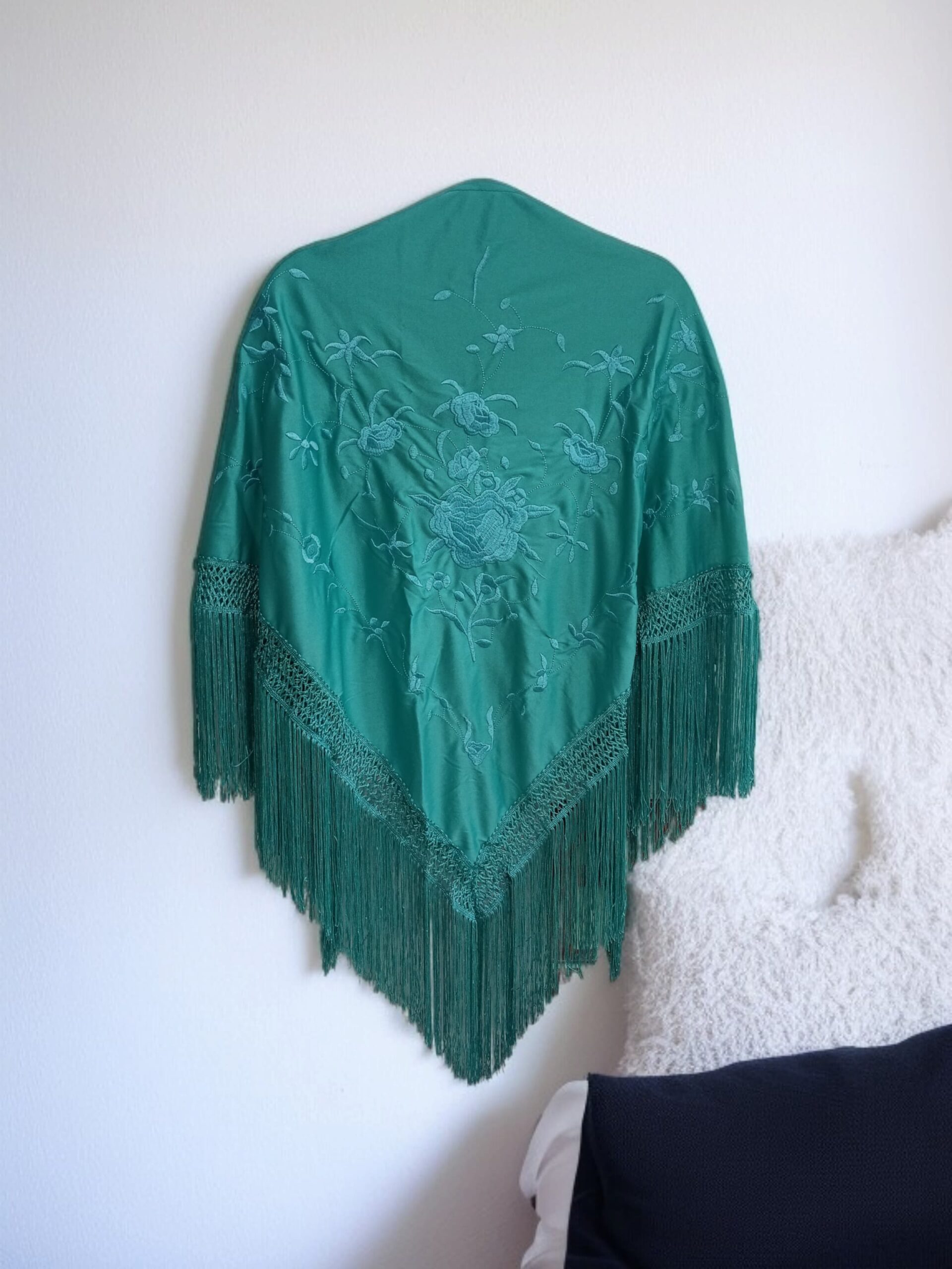 Mantoncillo de pico low cost. Color turquesa con bordado al tono. Ideal para lucirlo de todas las formas con tu traje o bata flamenca: clásico, cruzado…