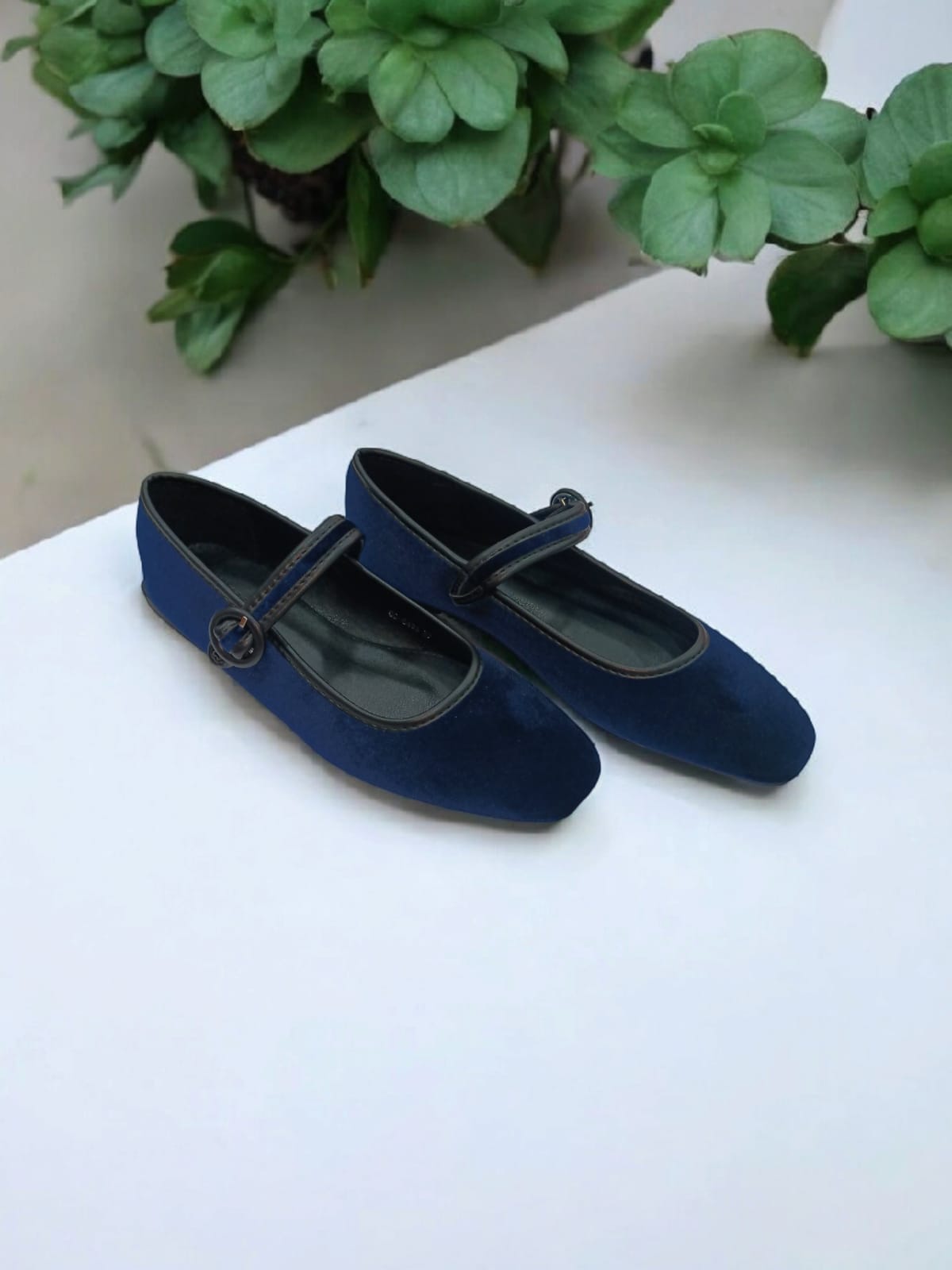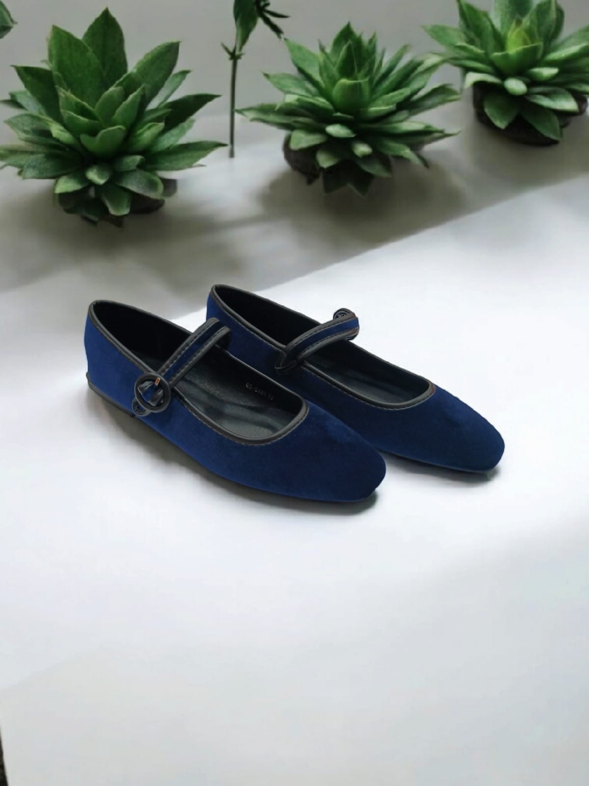 Merceditas de terciopelo en color azul marino. Plantilla acolchada para mayor comodidad y cierre de hebilla. Ligeras y cómodas para cualquier ocasión. Disponibles también en color verde caqui en la web.