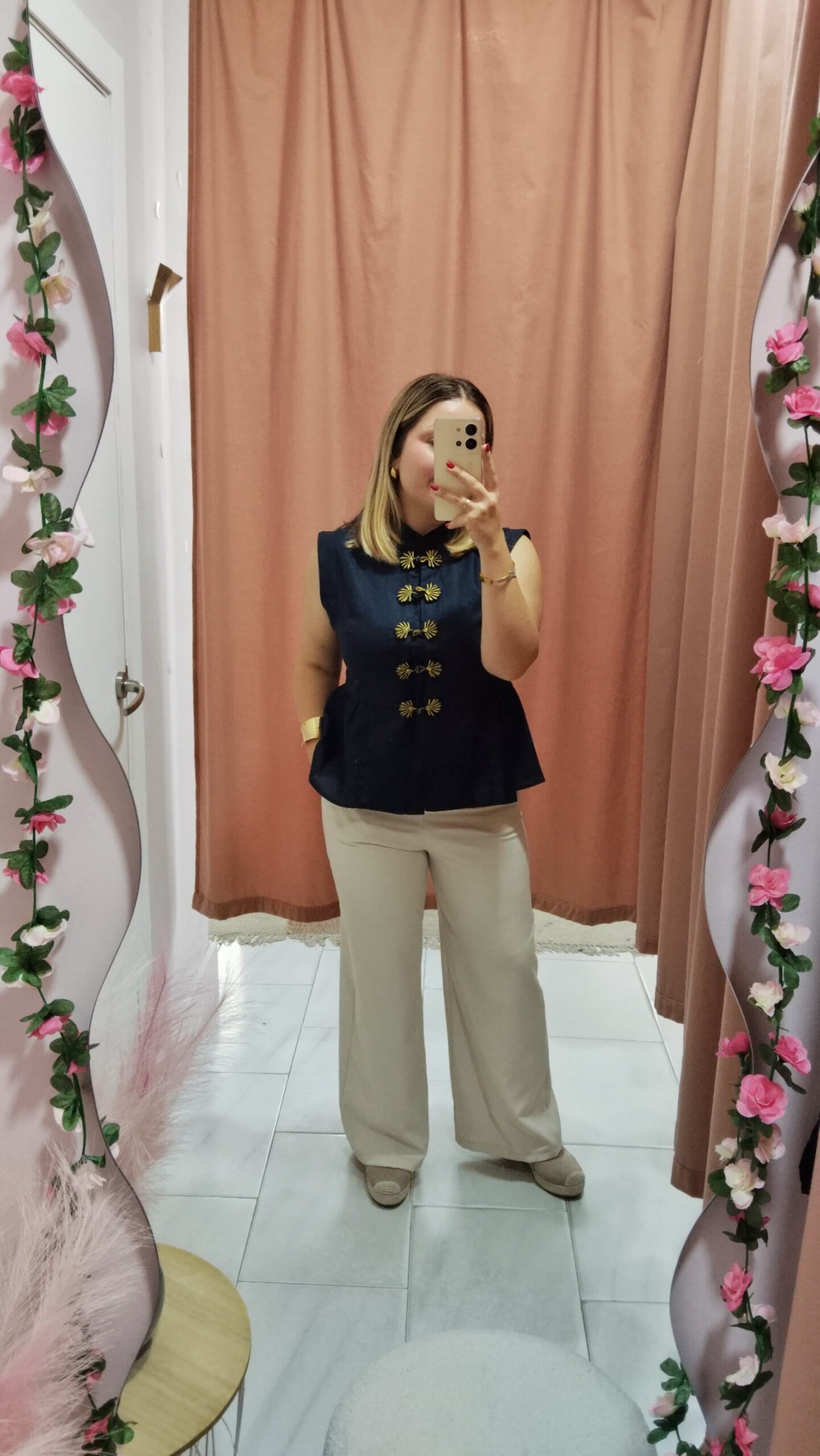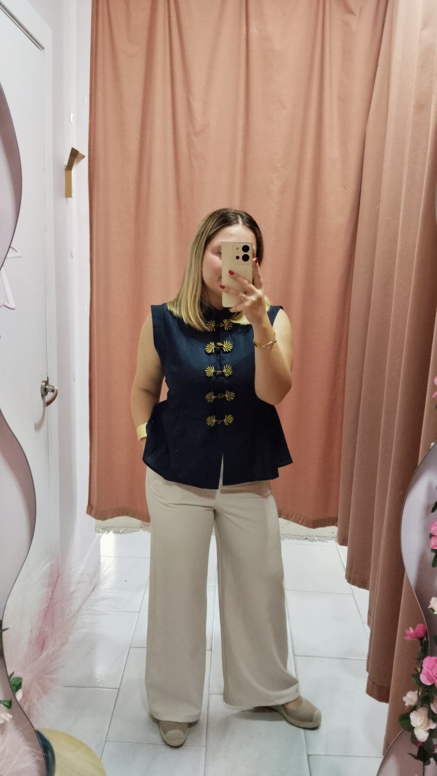 Pantalón de pinza en color beige, talla M. Lleva elástico en la cintura y se ajusta muy bien al cuerpo. Cierre con botón y cremallera. *Modelo usa habitualmente talla M*.