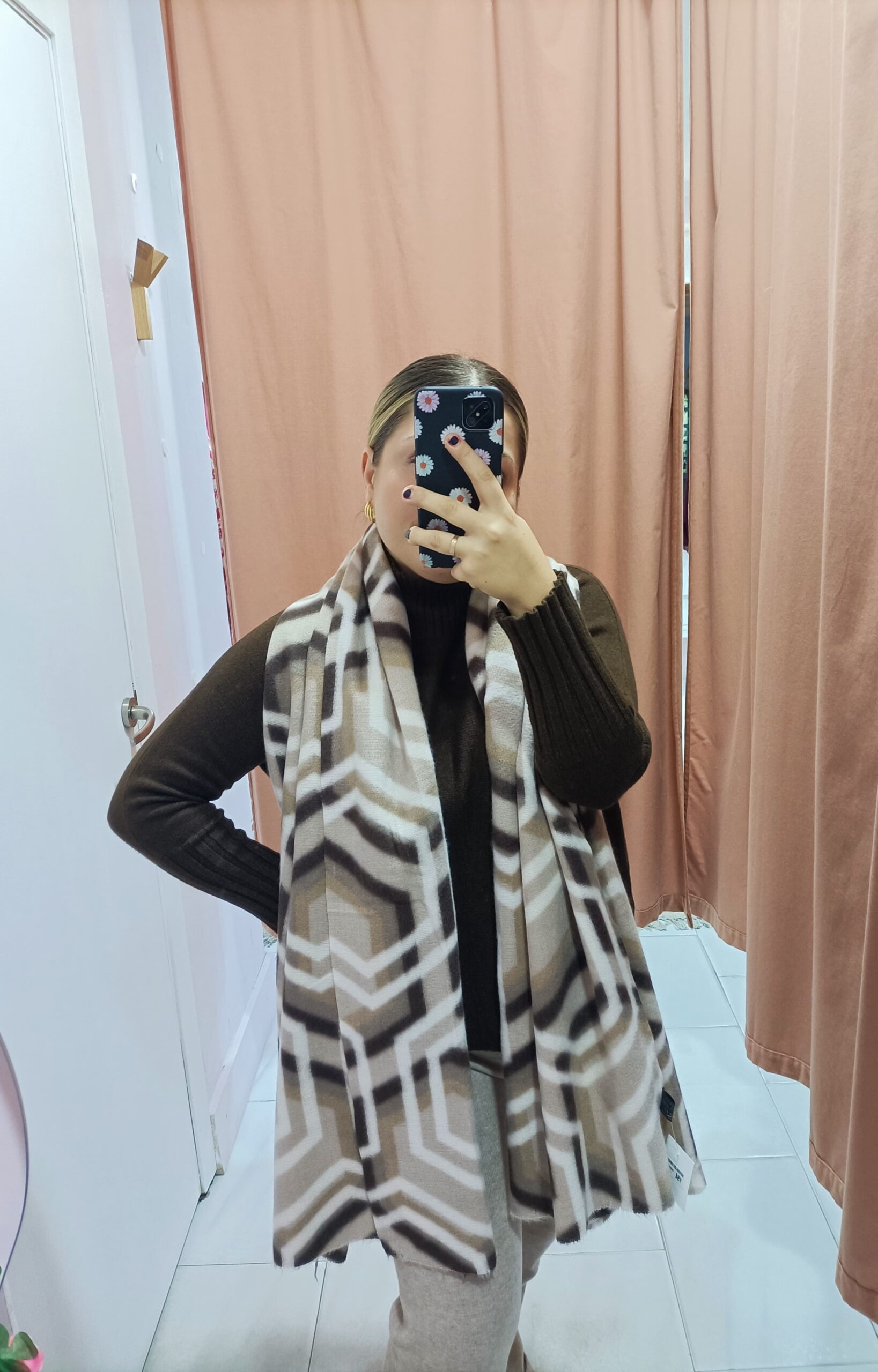 Pañuelo/estola confeccionado en un tejido súper suave y calentito con estampado en tonos marrones. Disponible en dos combinaciones de tonos.