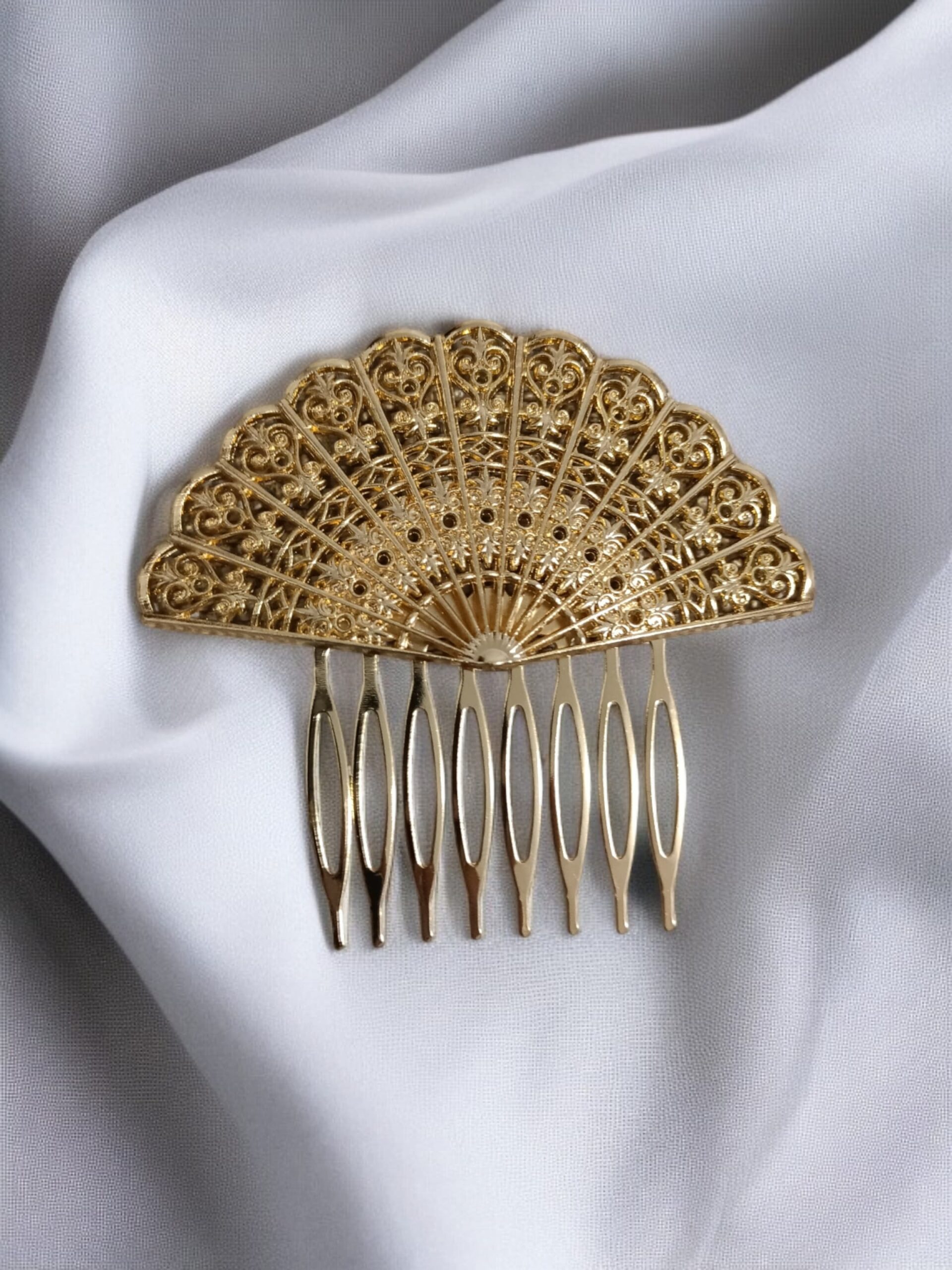 Peinecillo de latón con baño dorado, diseño abanico grande. Elige nuestro broche a juego.
