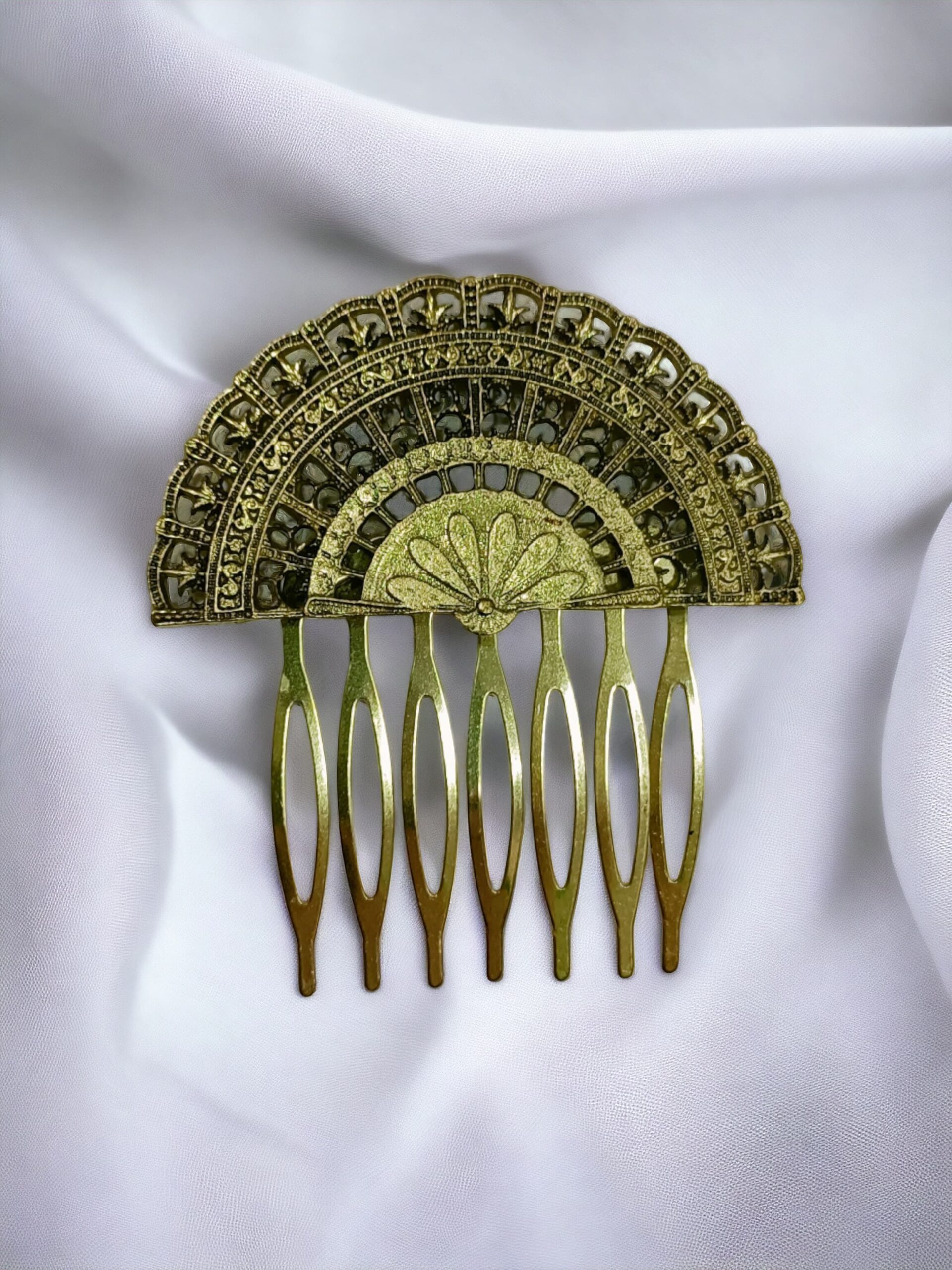 Peinecillo de latón con baño dorado mate en forma de abanico. Color bronce.