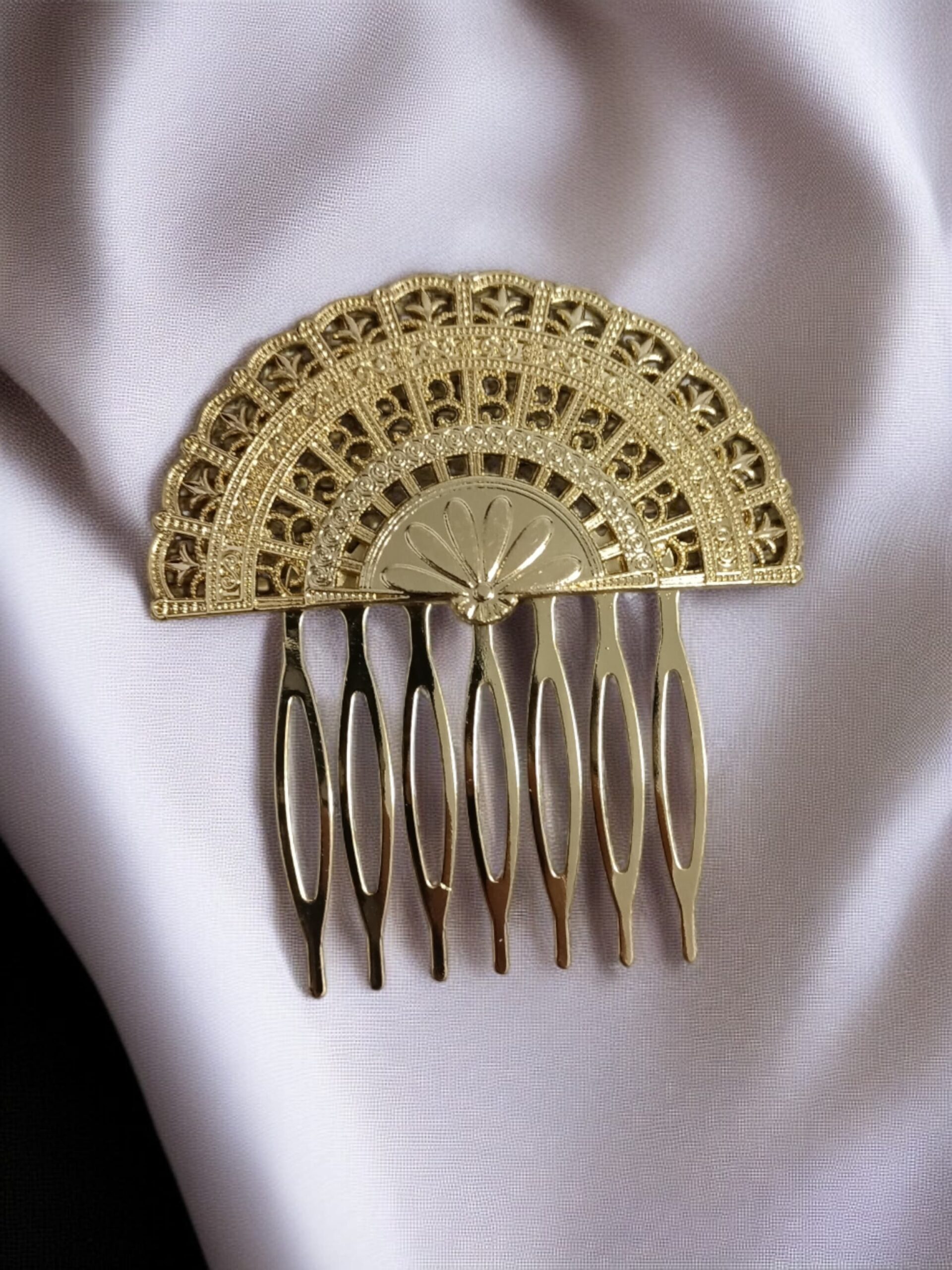 Peinecillo de latón con baño dorado mate en forma de abanico. Disponible también en color plata.