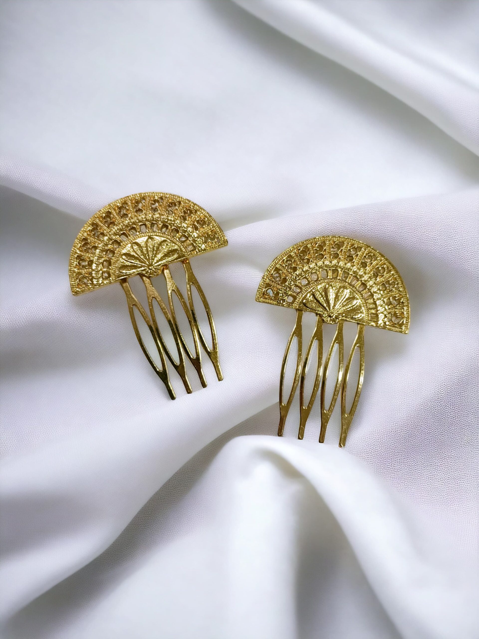 Peinecillo de latón con baño dorado mate, diseño de abanico.