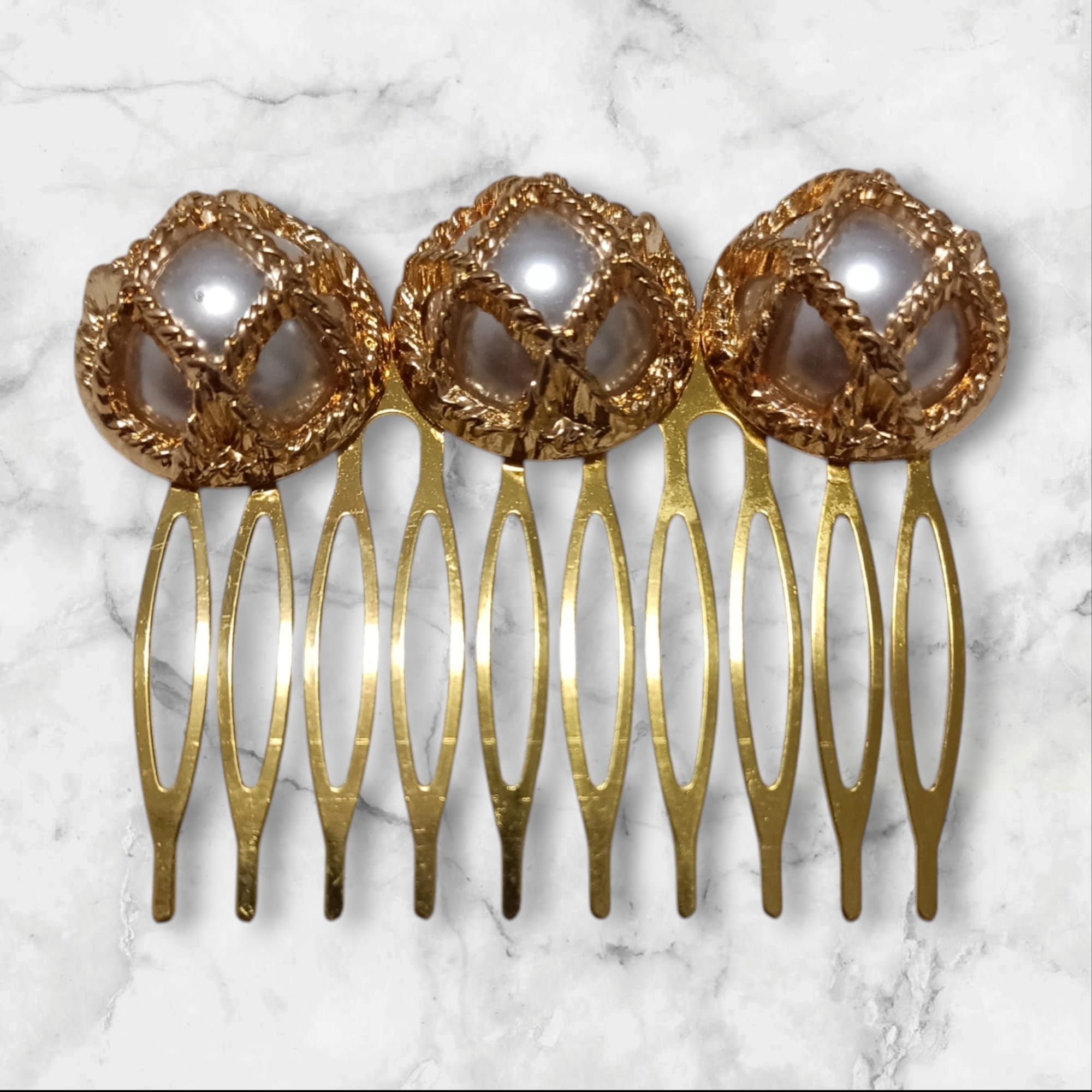 Peinecillo diseño botón, color blanco perla y dorado.