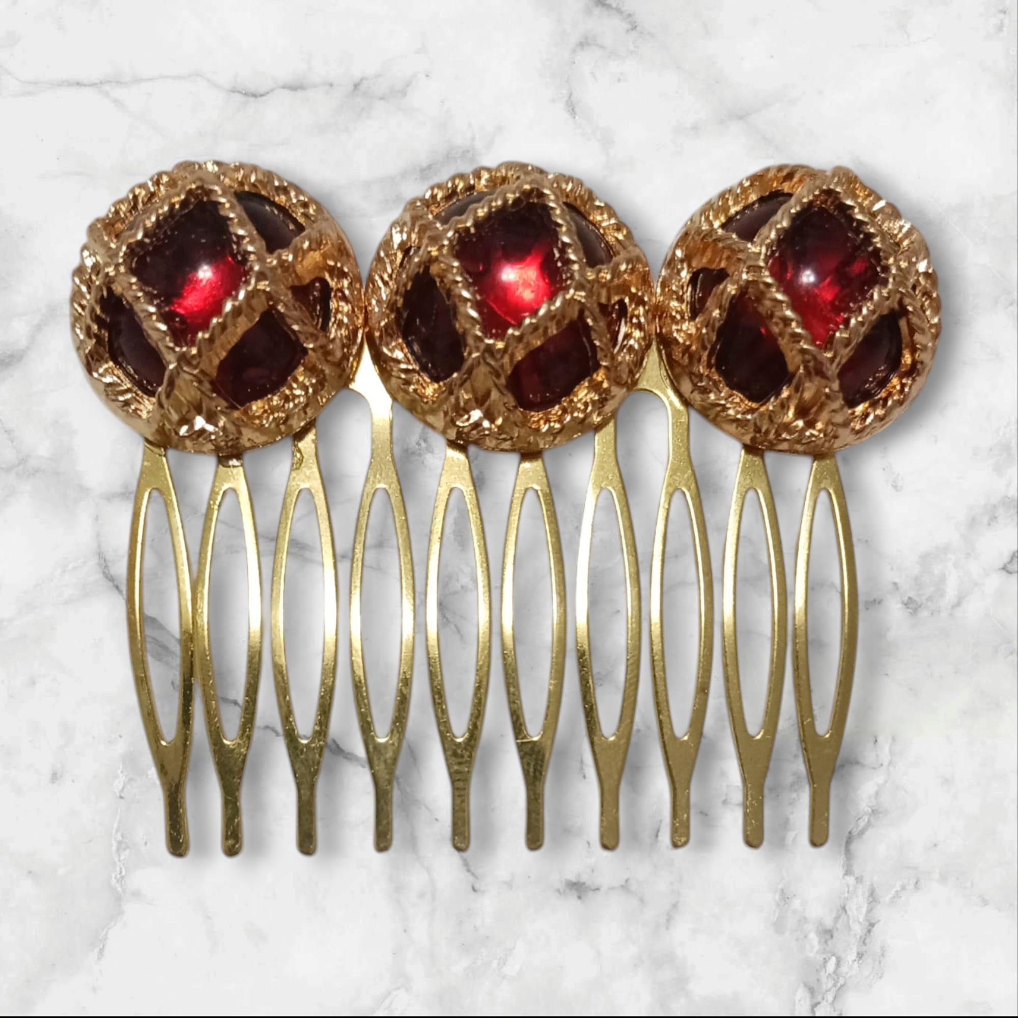 Peinecillo diseño botón, color burdeos y dorado.