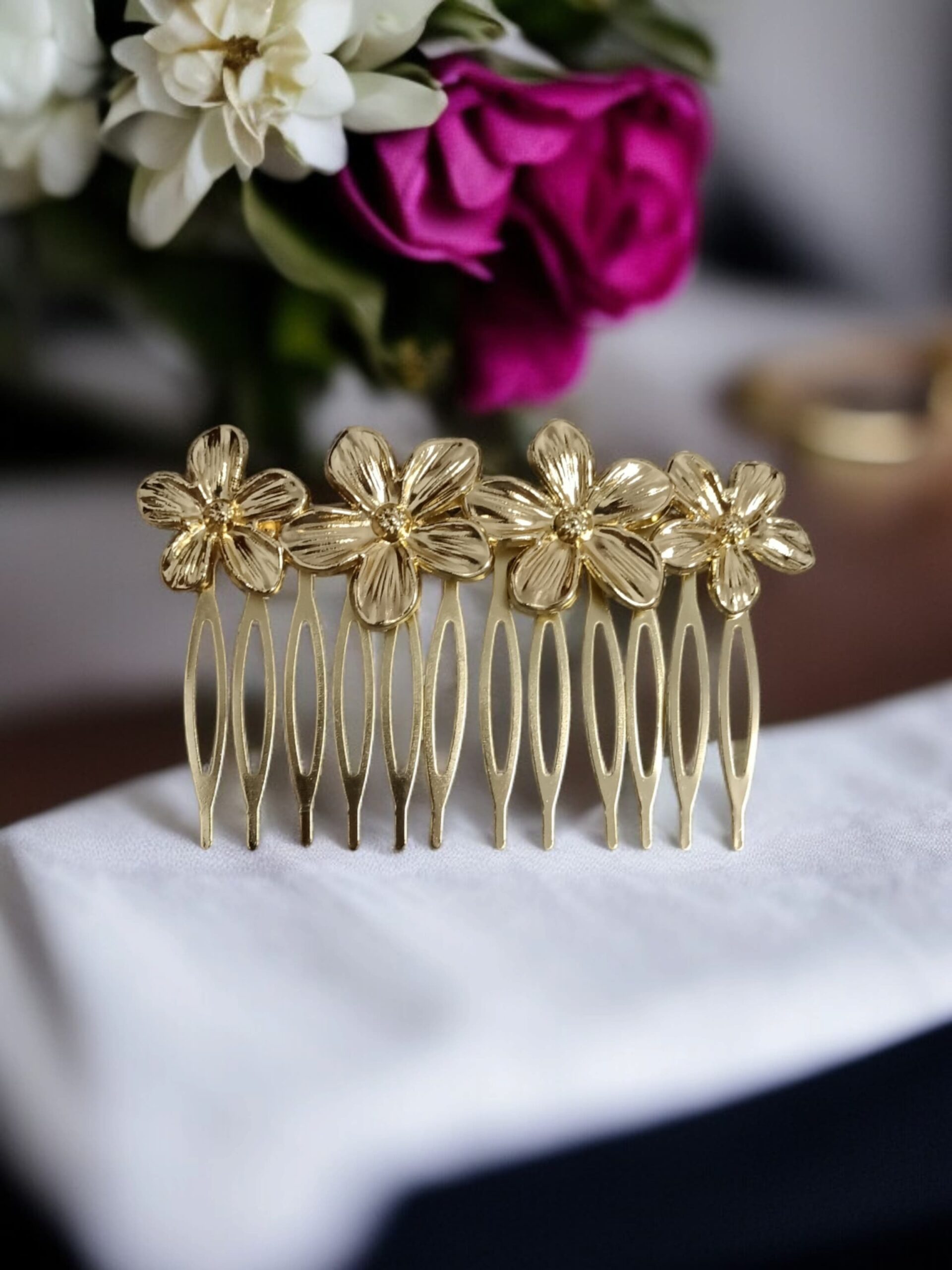 Peinecillo de latón con baño dorado, diseño cuatro flores.