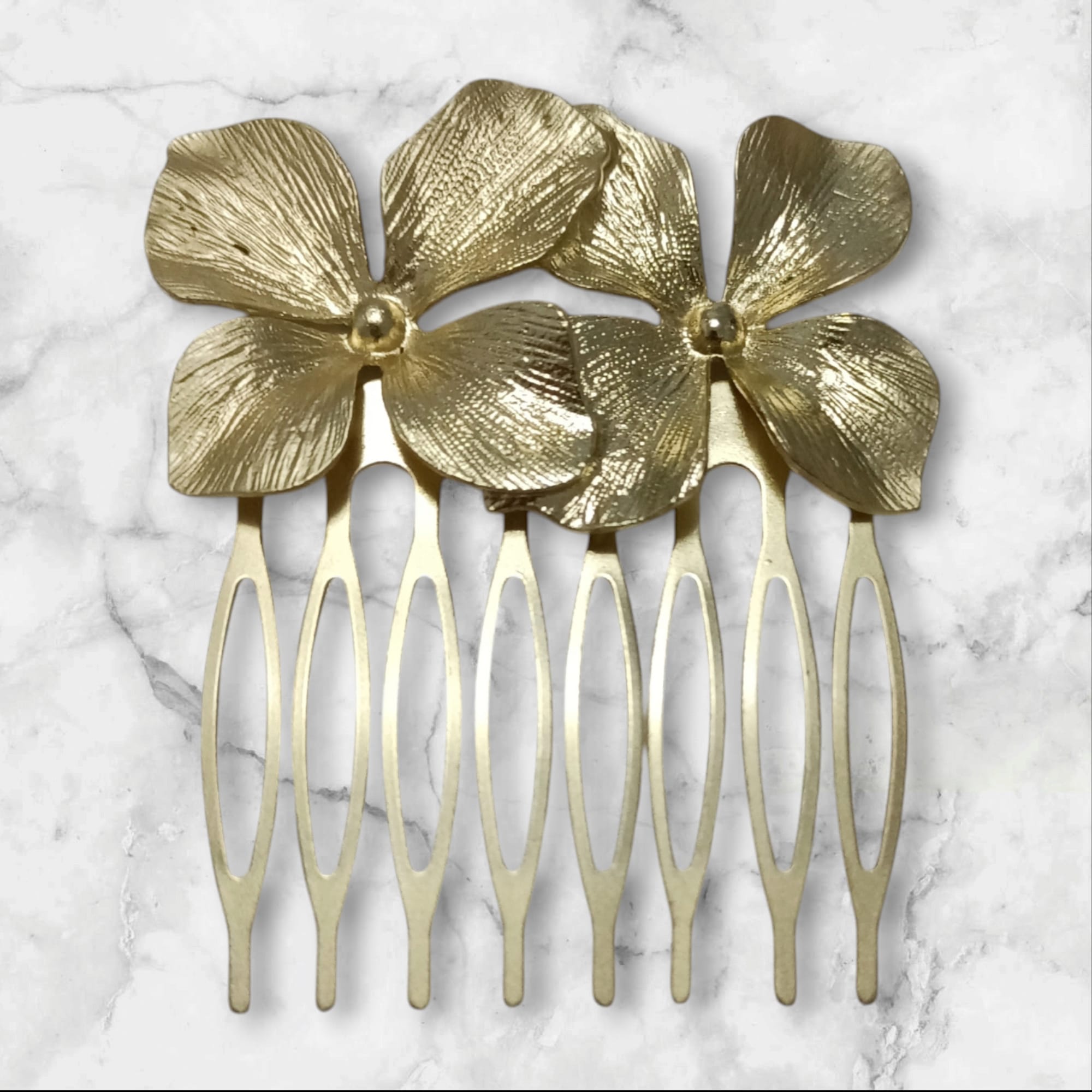 Peinecillo diseño doble hortensia, color dorado mate. Combínalo con nuestro broche doble hortensia a juego.