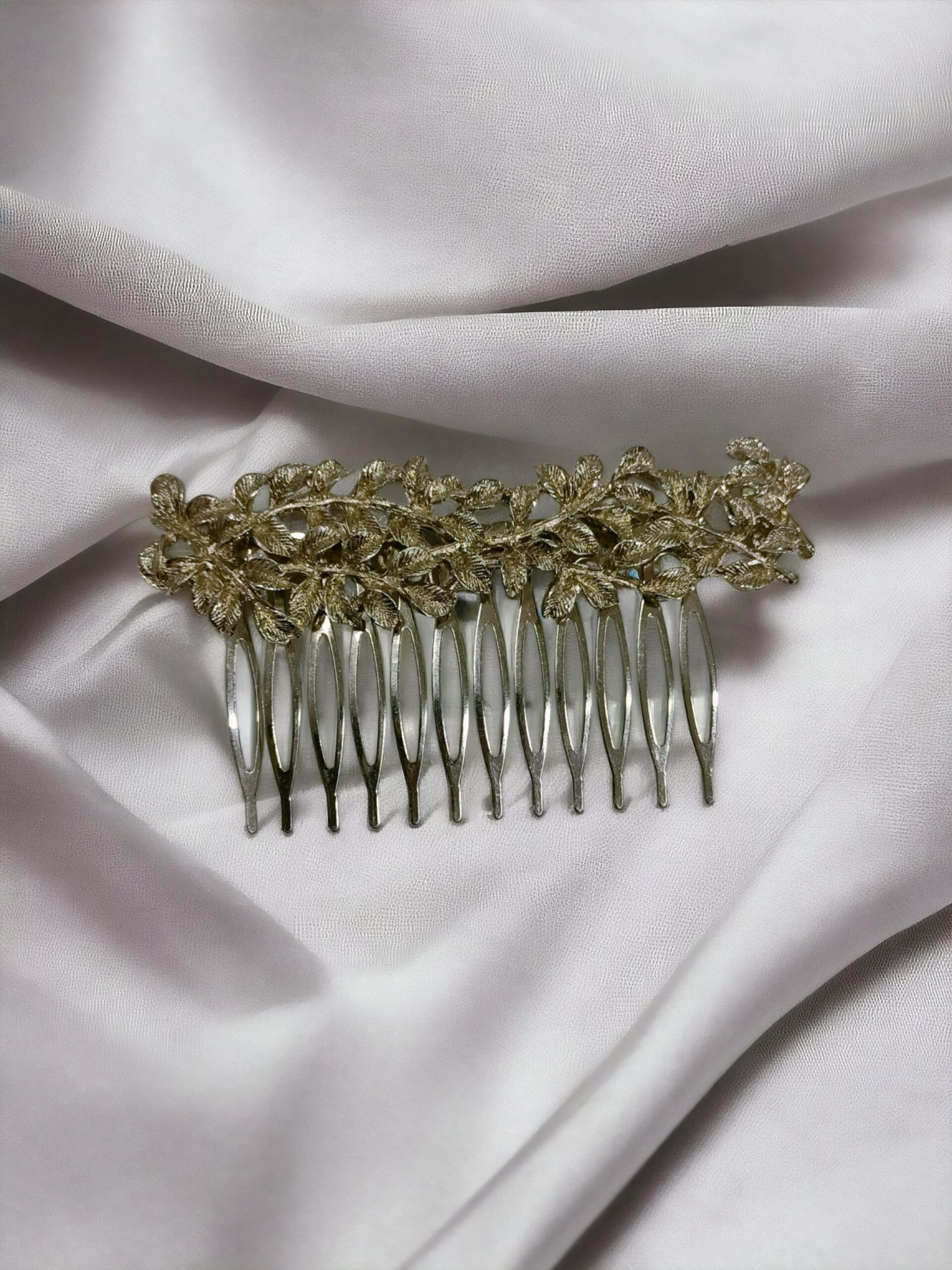 Peinecillo de rodio con baño plateado con diseño de ramitas con hojas.