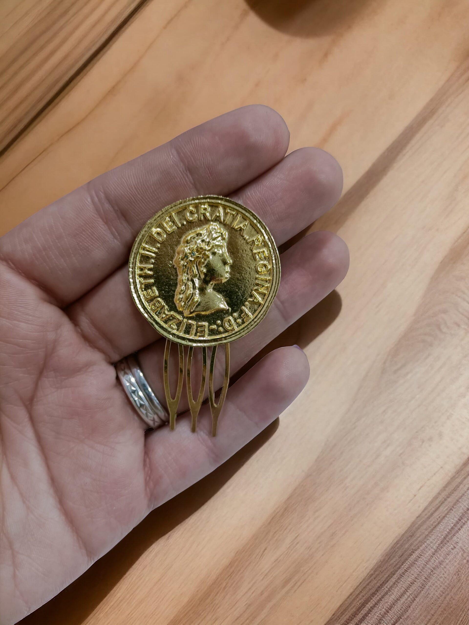 Peinecillo de latón con baño dorado mate, diseño de moneda.