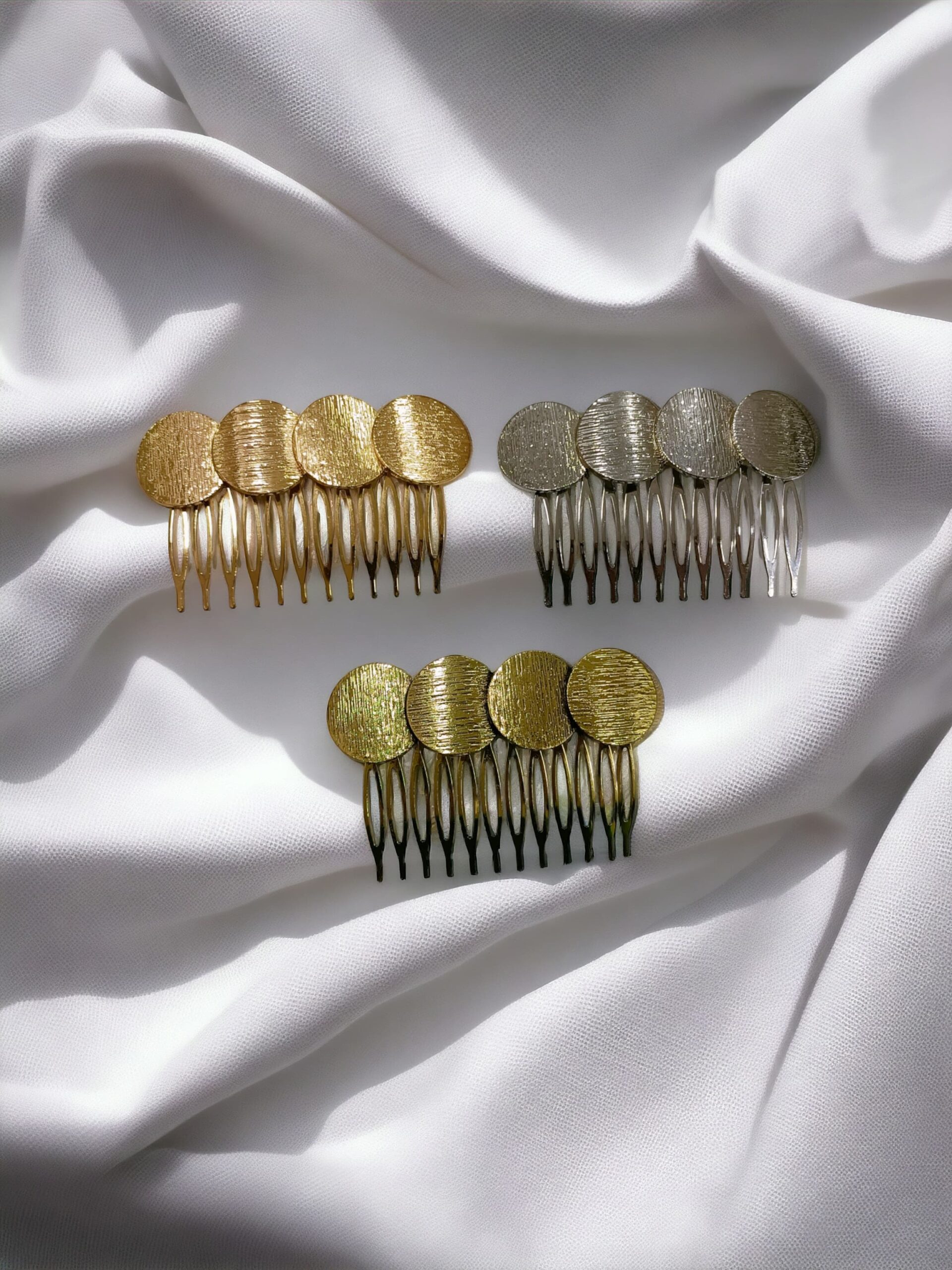 Peinecillo de latón con diseño de monedas/círculos. Disponibles en 3 colores: dorado, plateado y bronce.