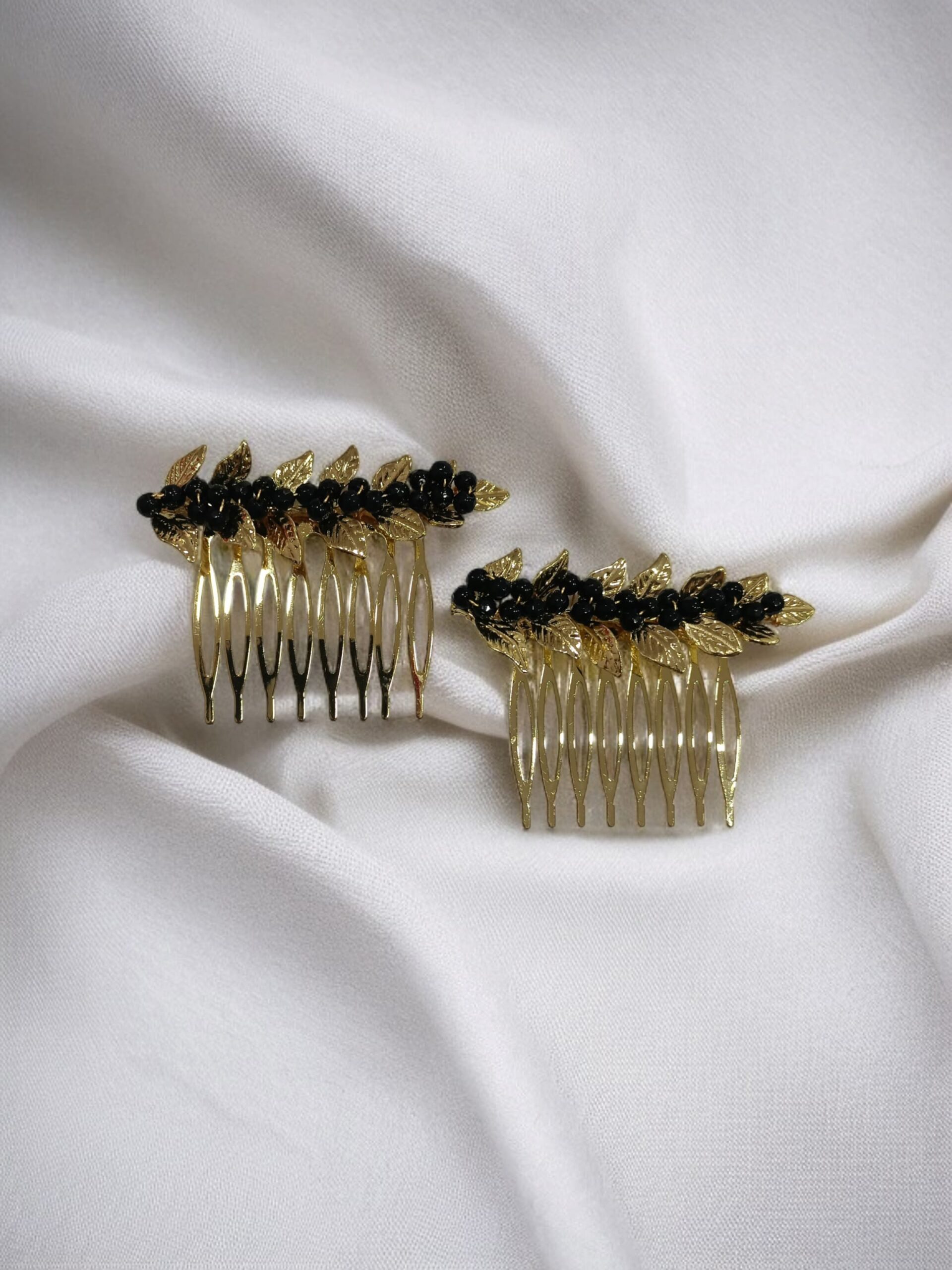 Peinecillo de latón con baño dorado, diseño hojas con bolitas en color negro. Disponible también en color beige, rojo y verde en la web.