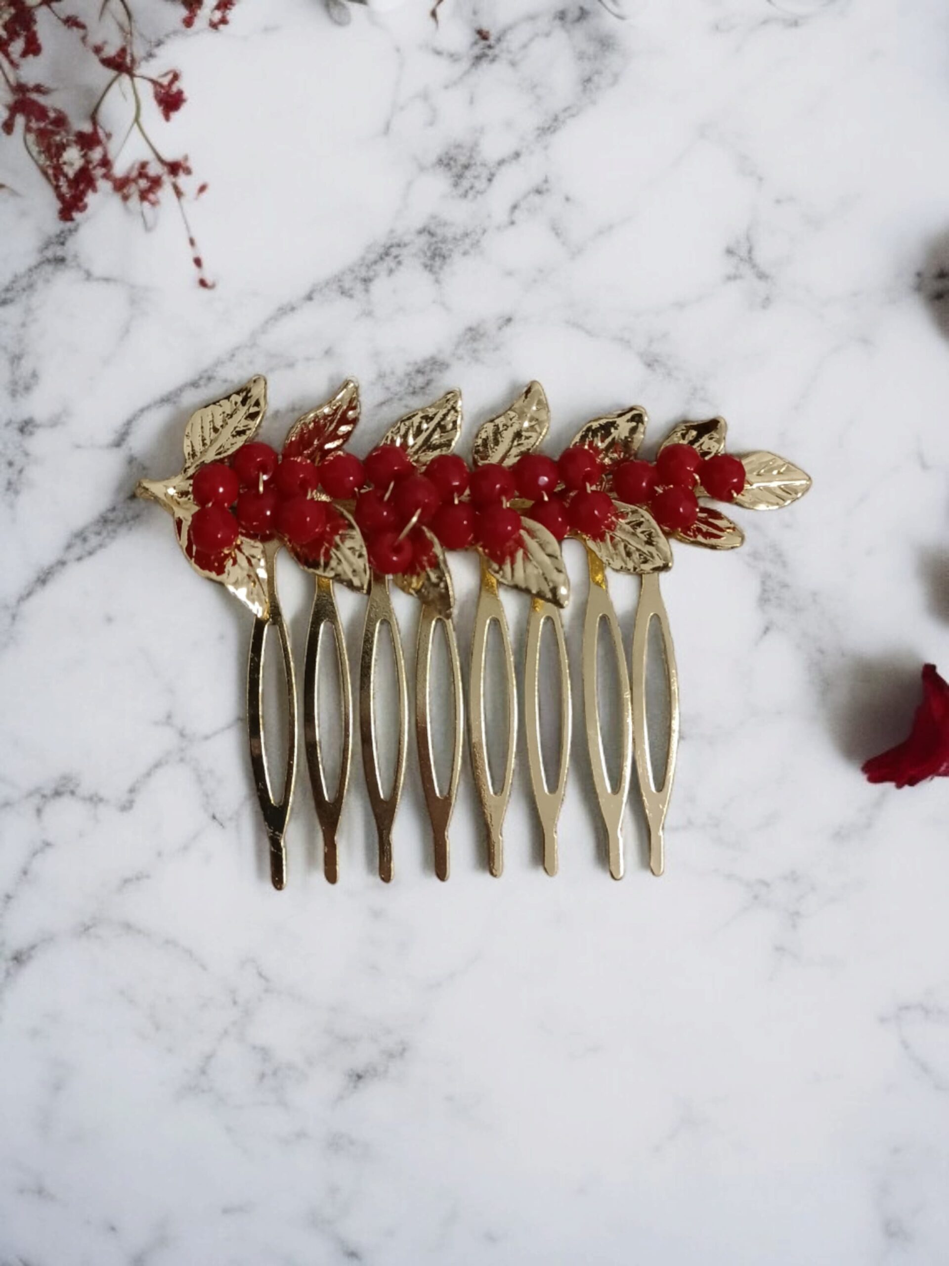 Peinecillo de latón con baño dorado, diseño hojas con bolitas en color rojo. Disponible también en color beige, negro y verde en la web.