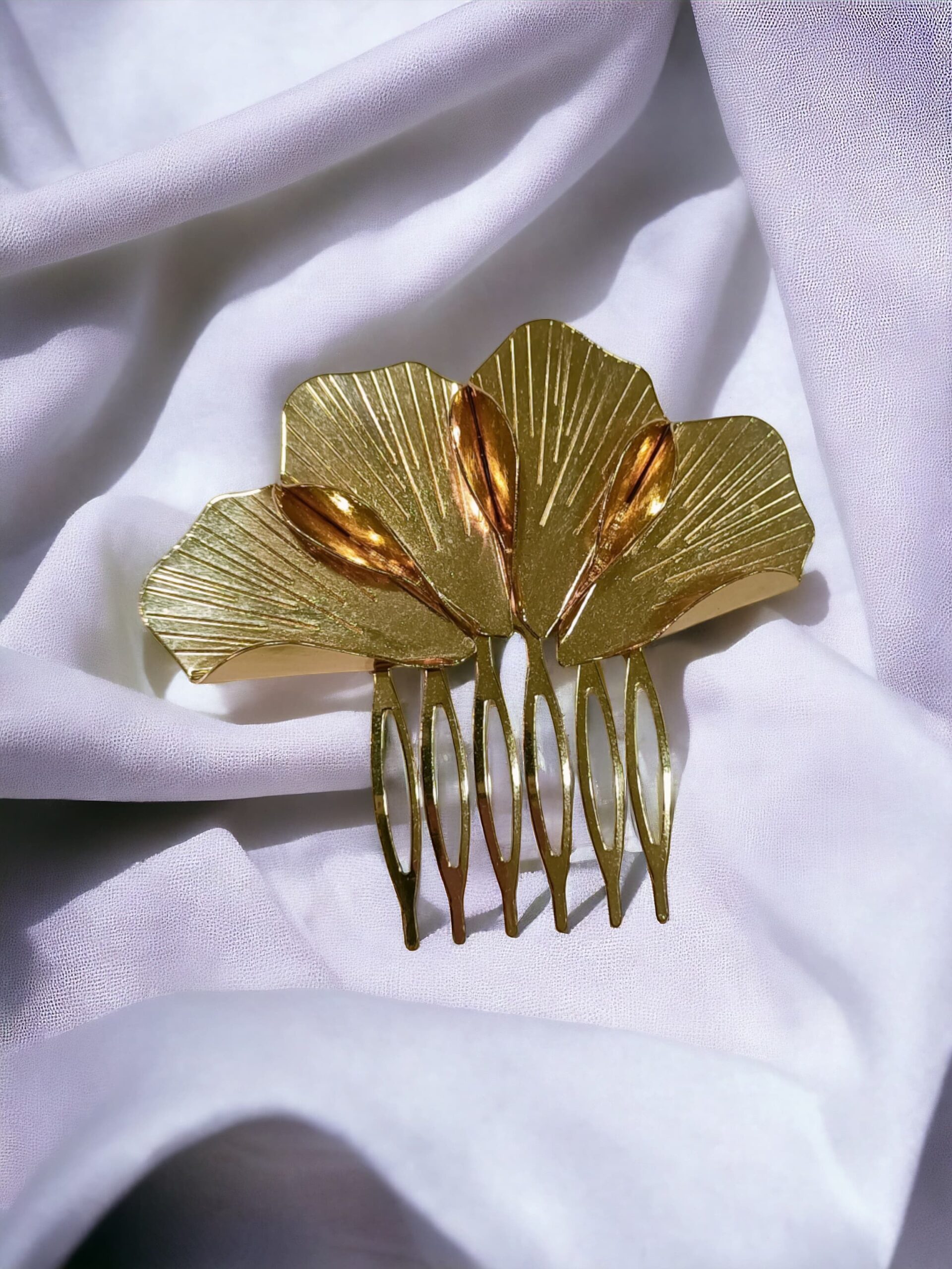 Peinecillos de latón en baño dorado, diseño de hoja con relieve.