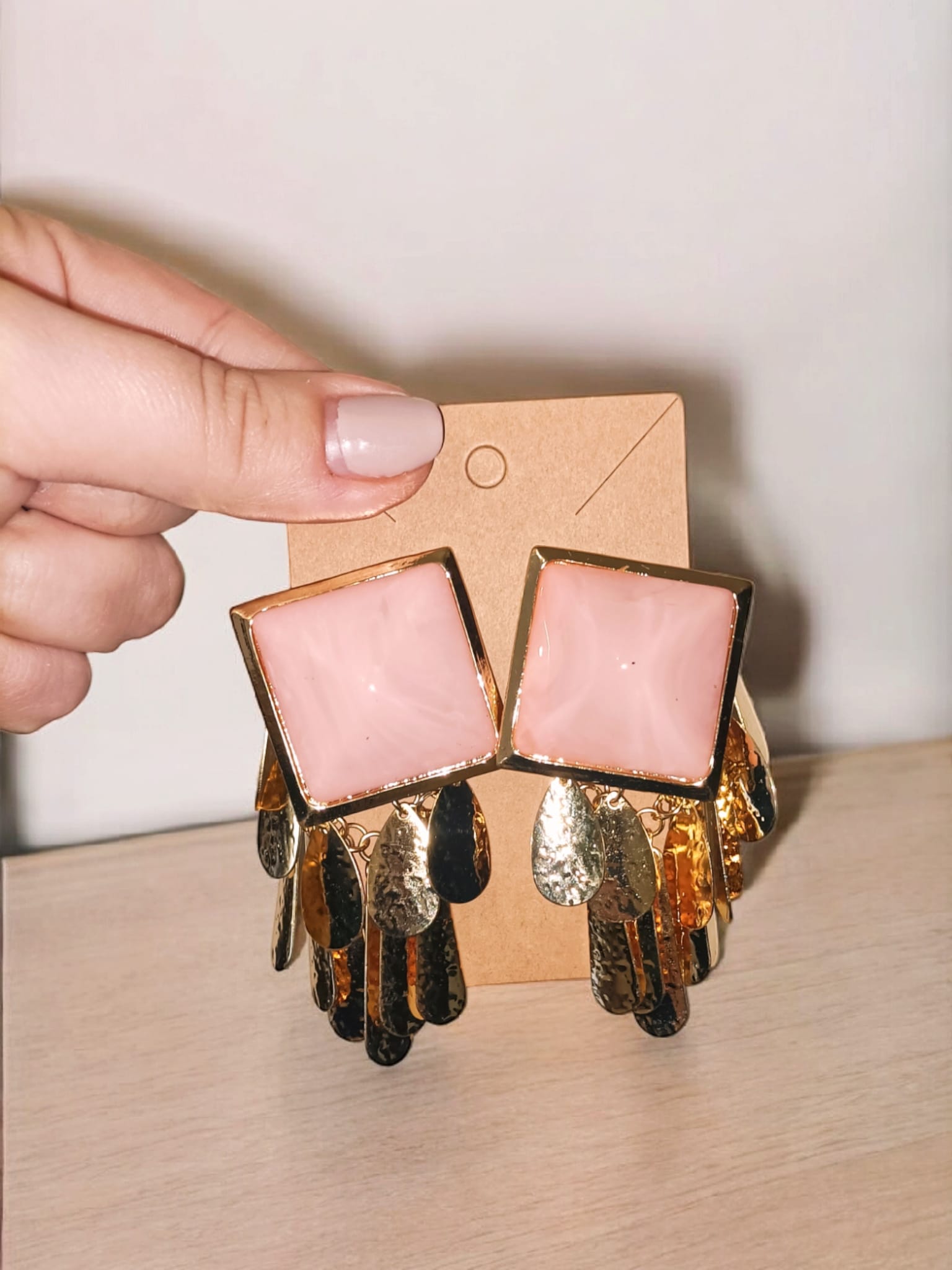 Pendientes de flamenca diseño rombo en color rosa pastel y multi pétalos en dorado.
