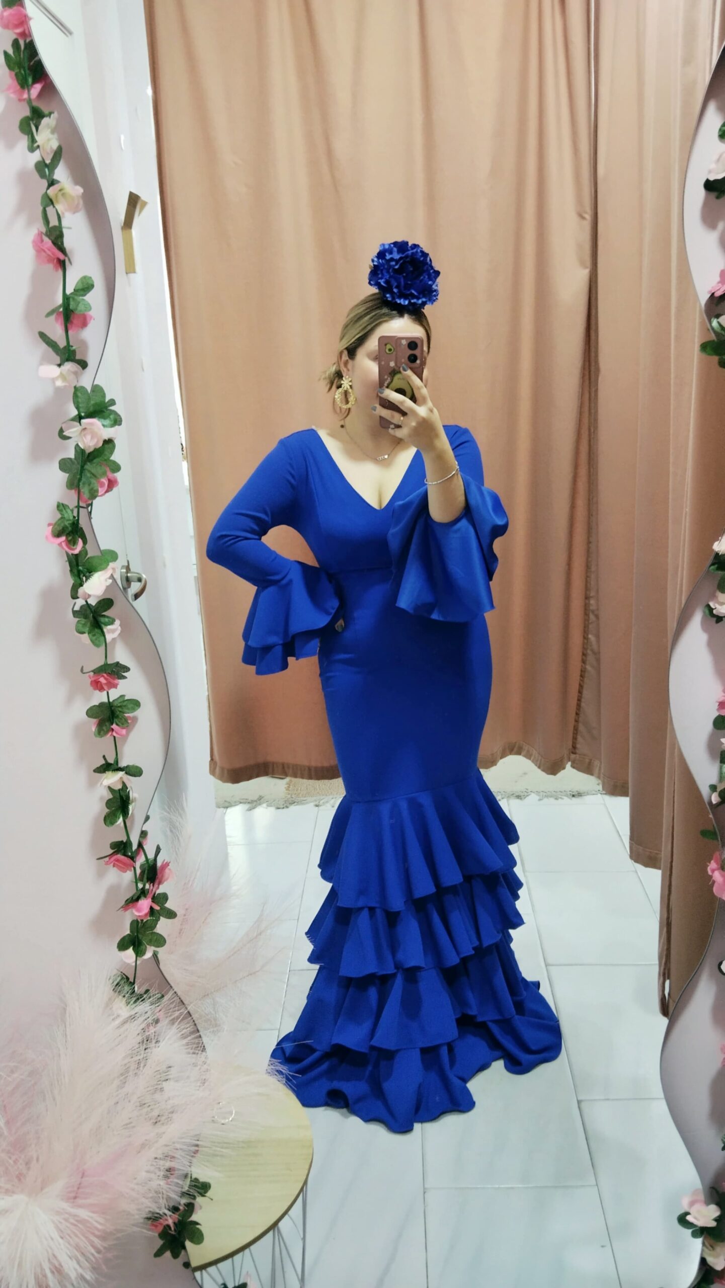 Precioso traje de flamenca con escote de pico, falda con 4 volantes y mangas largas terminadas en dos volantes. Composición: 95% poliéster y 5% elastano. Lleva licra, por lo que es bastante elástico, da mucha talla y estiliza mucho la figura.