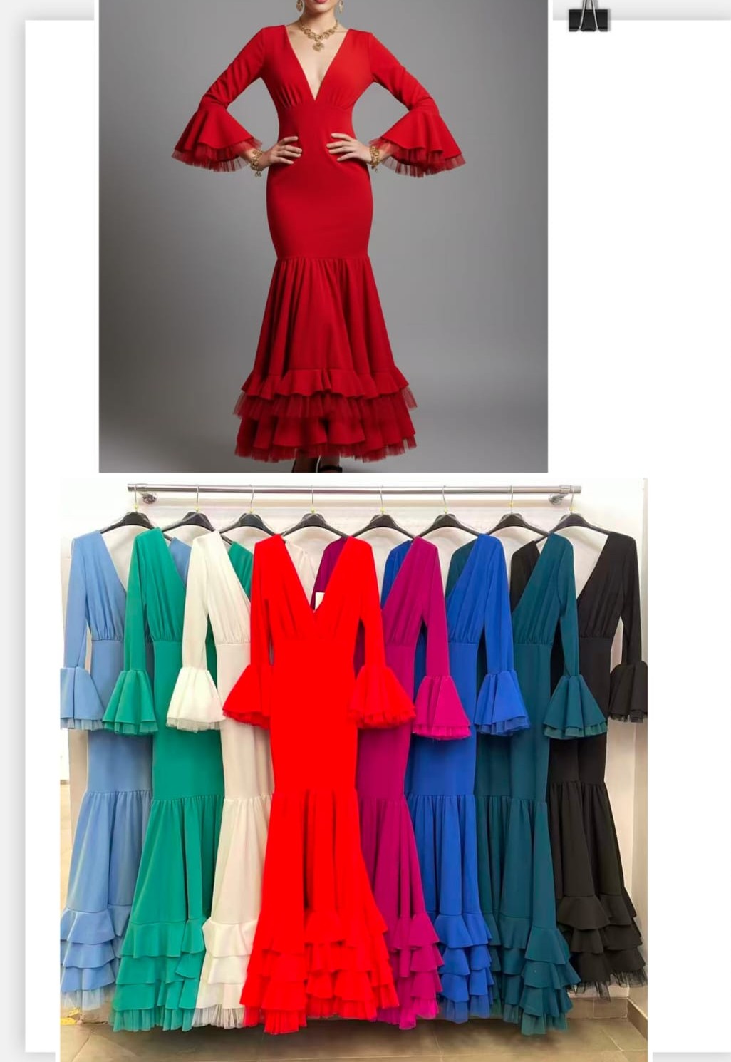 Precioso traje de flamenca canastero. Escote en V y mangas largas terminadas en volantes. Composición: 95% poliéster y 5% elastano. Lleva licra, por lo que es bastante elástico, da mucha talla y estiliza mucho la figura.