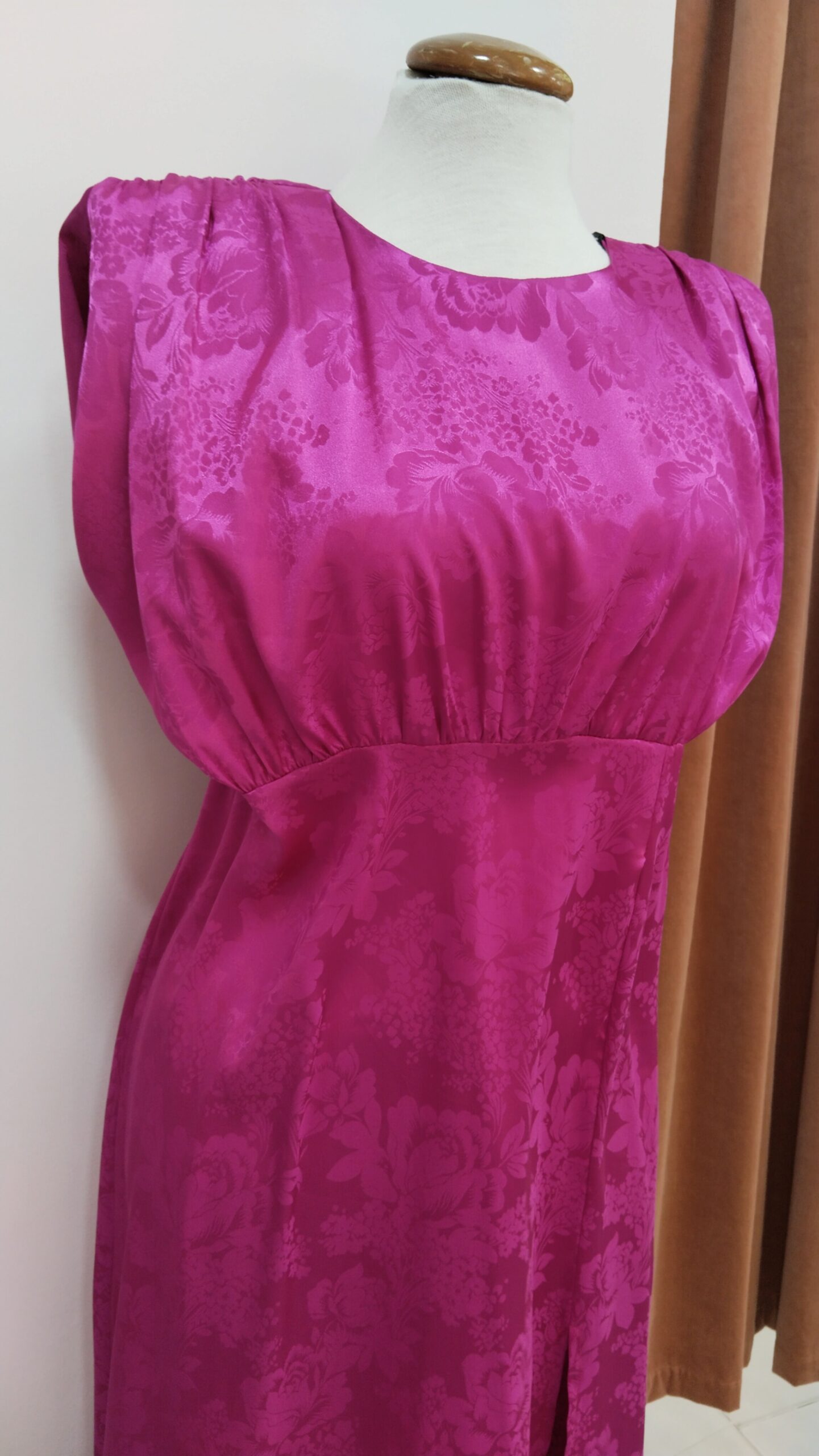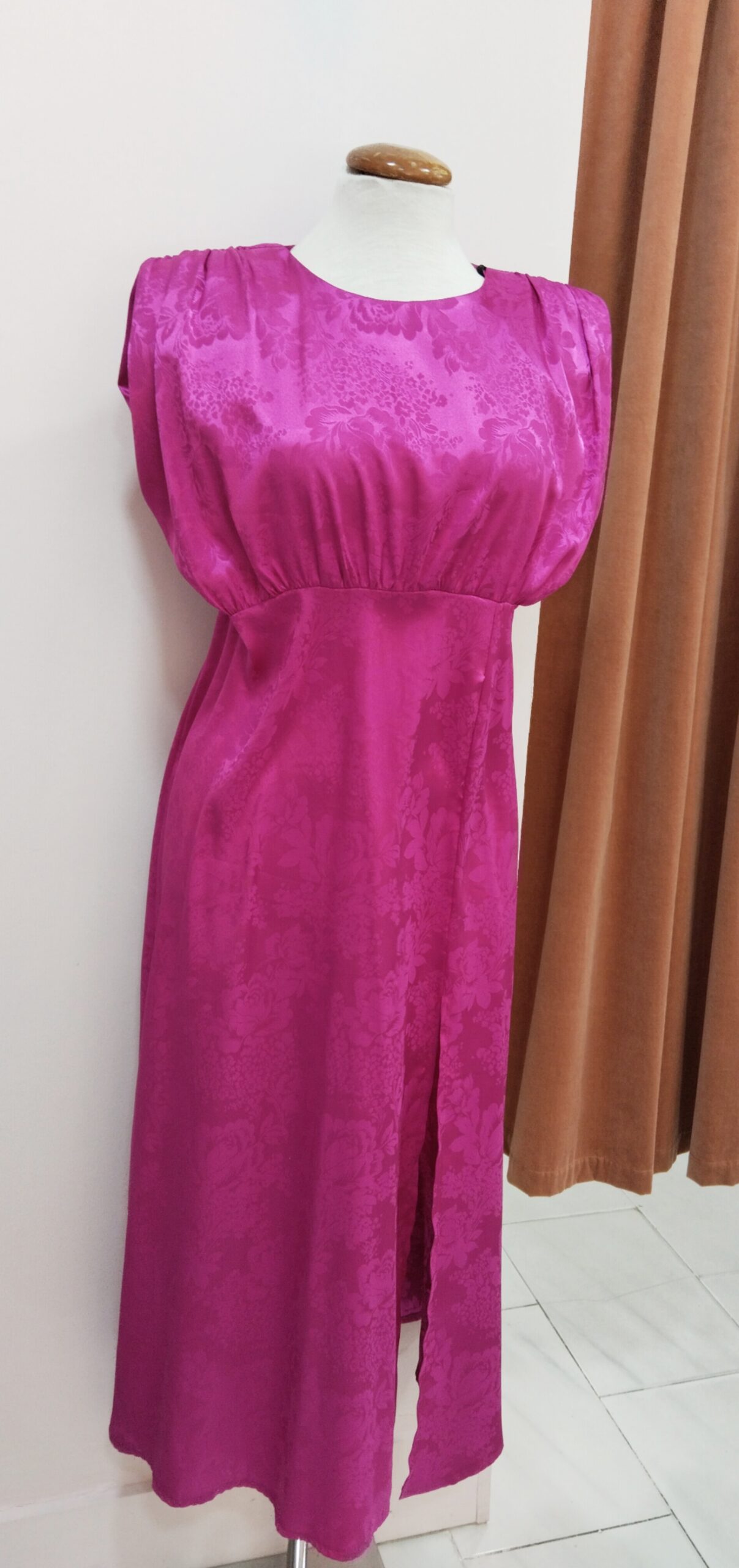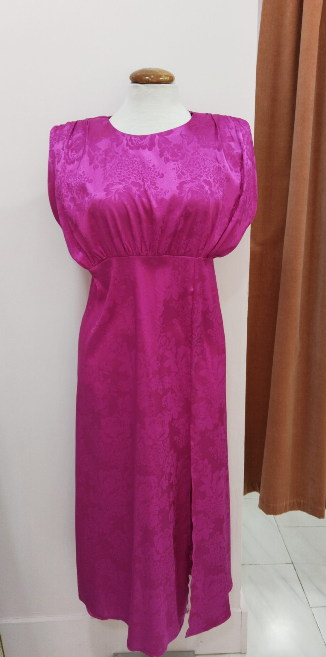 Vestido corte midi color fucsia. Escote redondo y hombreras. Abertura en la pierna izquierda y cierre con cremallera oculta en la espalda. Tallaje grande. Talla S, pero equivale a la talla M – L aproximadamente.