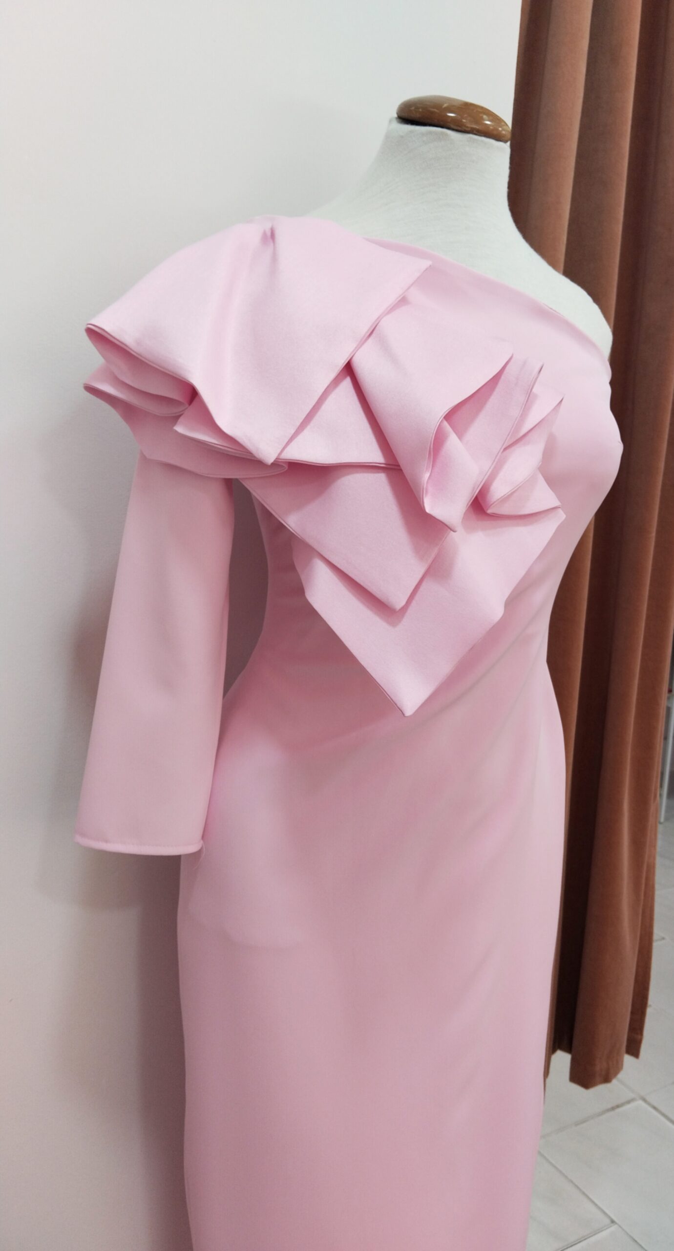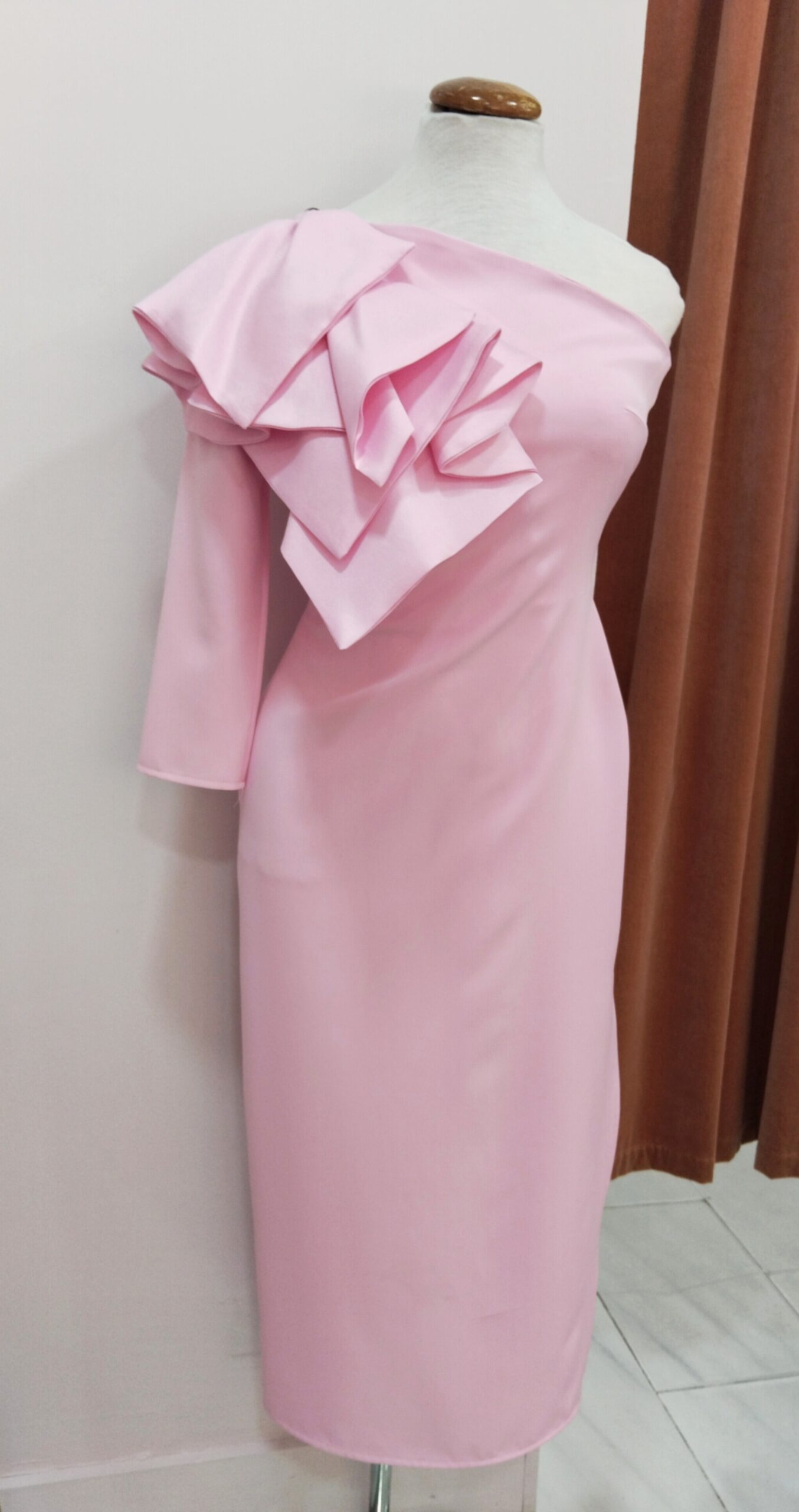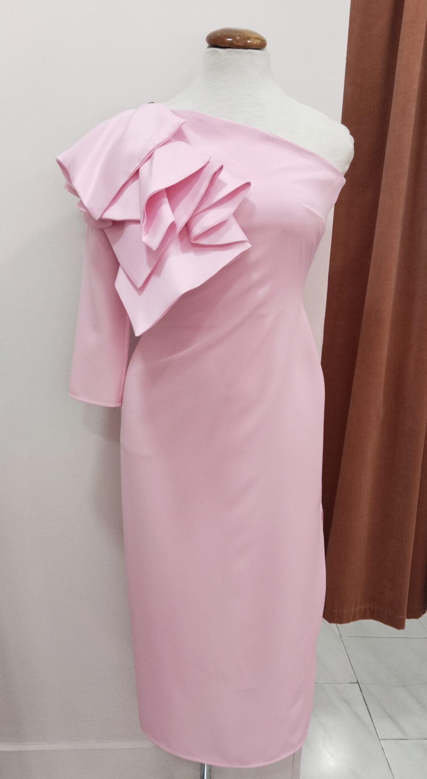 Vestido corte midi color rosa. Escote asimétrico de una manga con detalle flor en el hombro. Abertura en la pierna izquierda. Cierre con cremallera invisible en el extremo derecho. Tela ligeramente elástica, adaptándose y estilizando tu figura. Ideal para eventos de día.