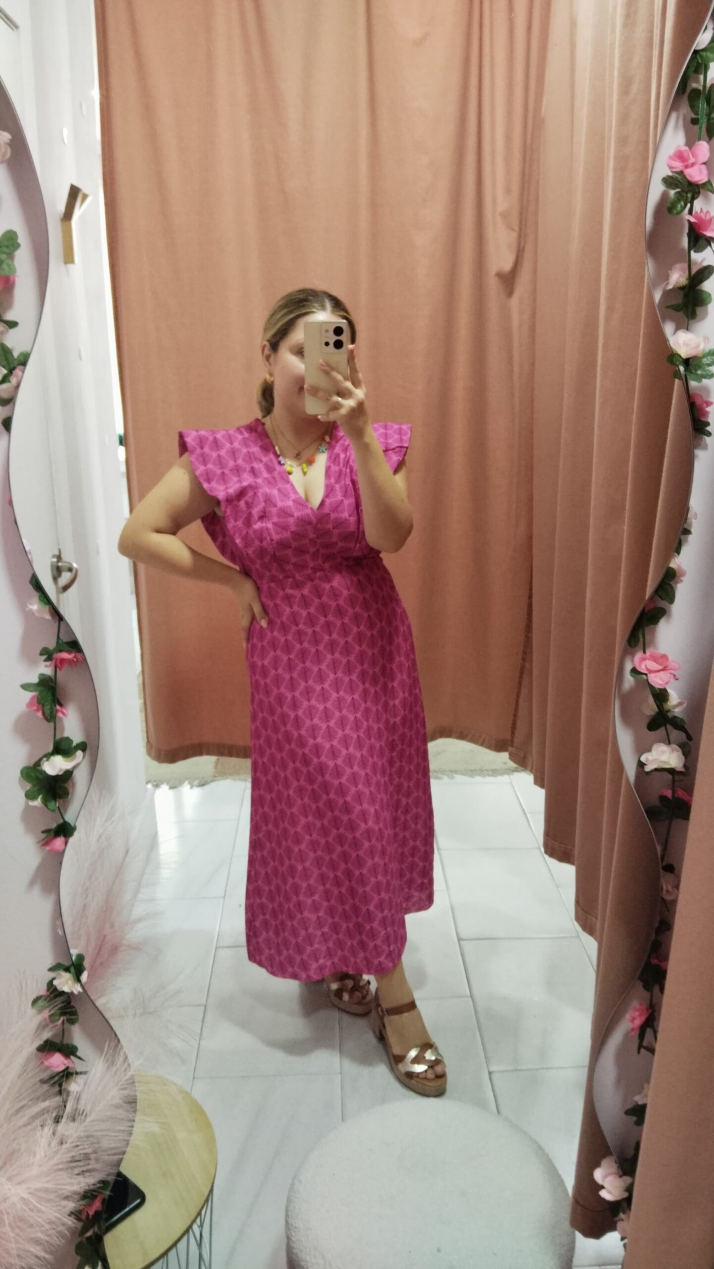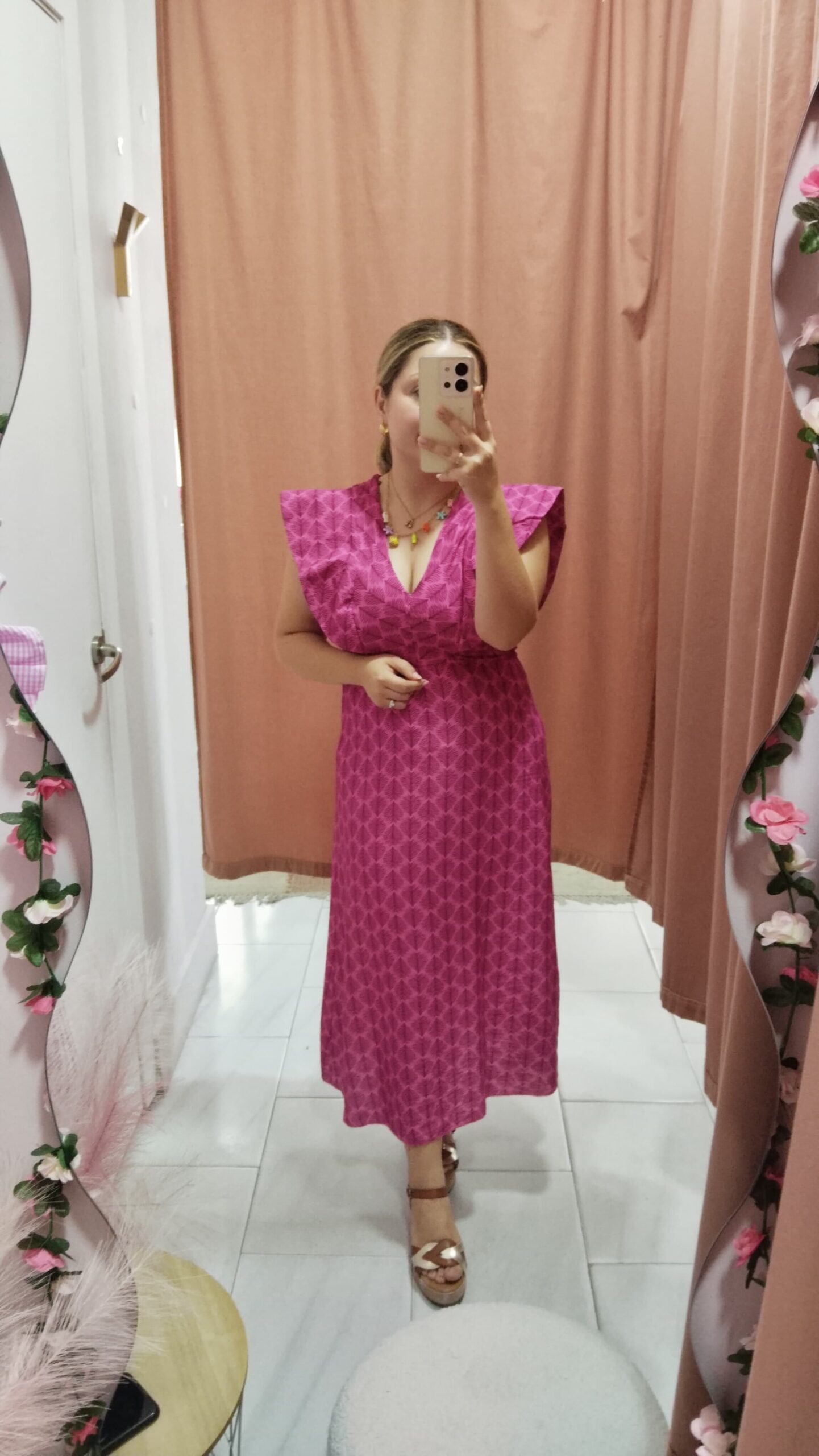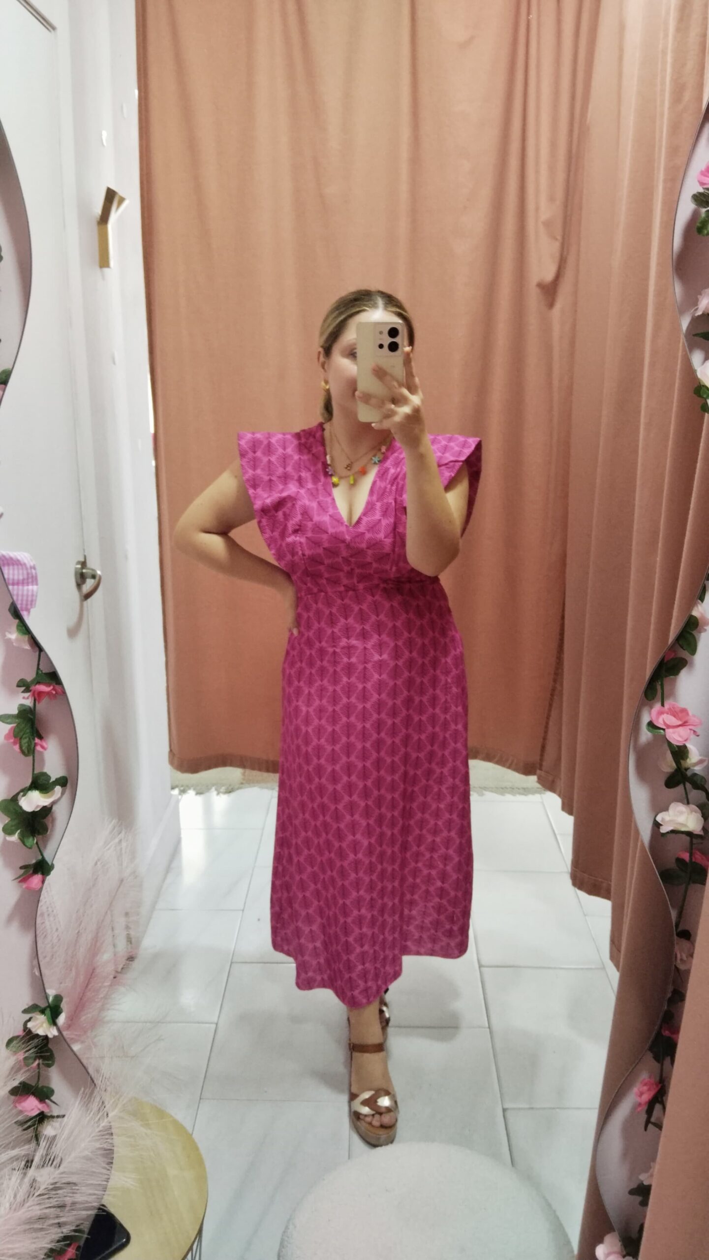 Precioso vestido corte midi con estampado en tonos buganvilla. Solapas en los hombros, escote en V y tejido elástico nido de abeja en la espalda. Ideal para cualquier ocasión o evento.