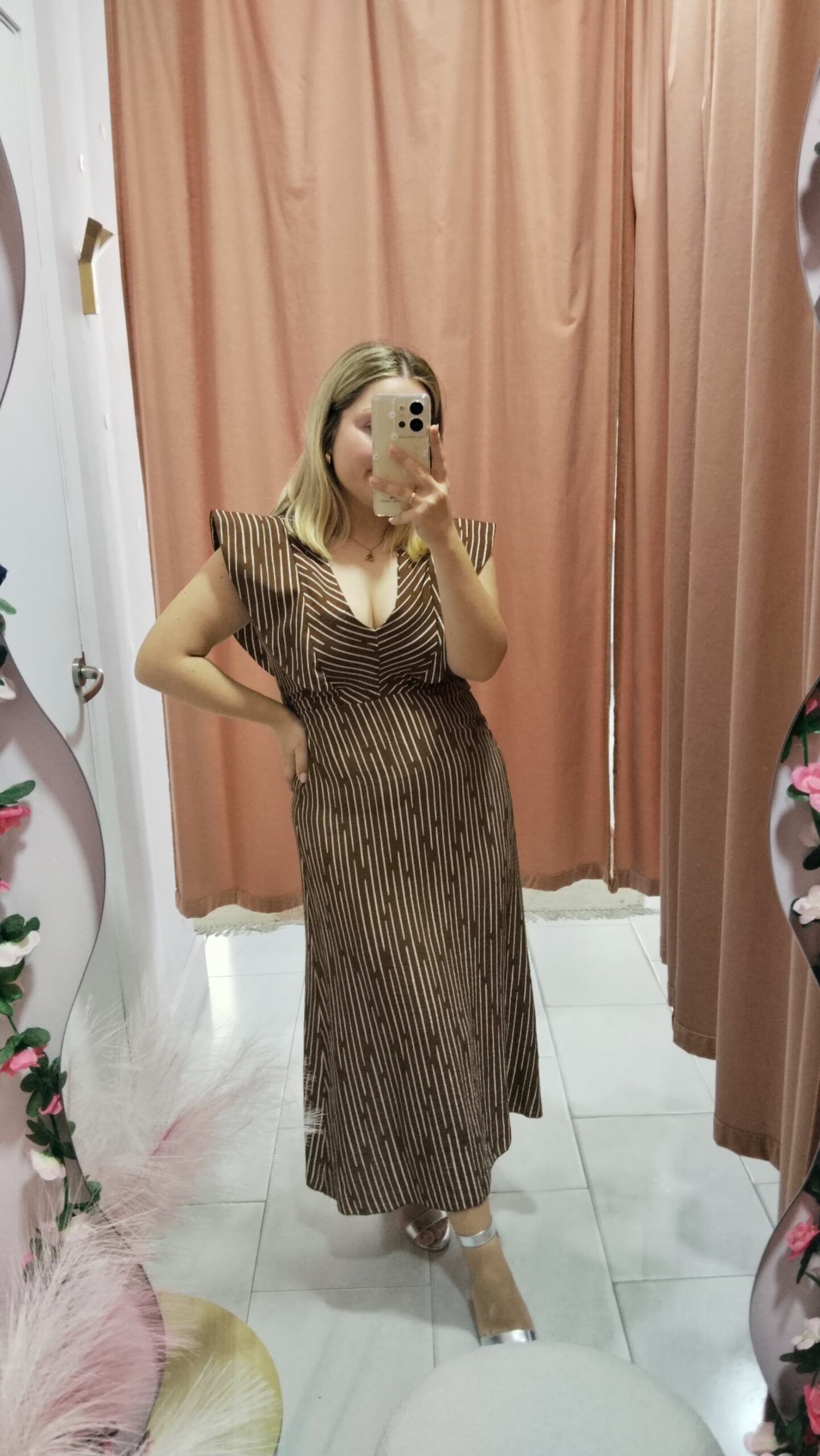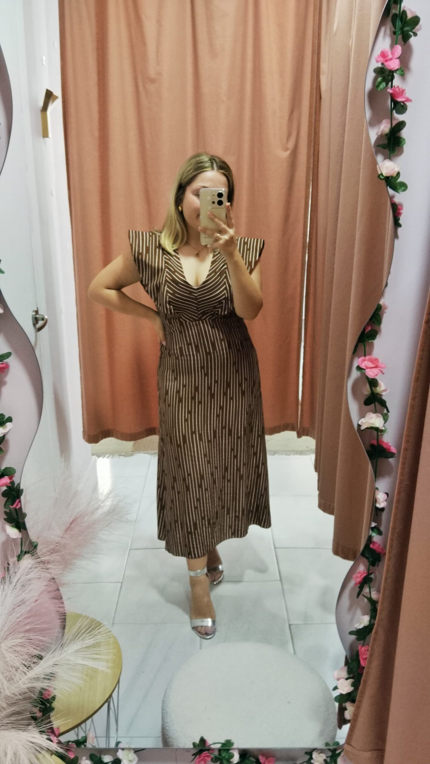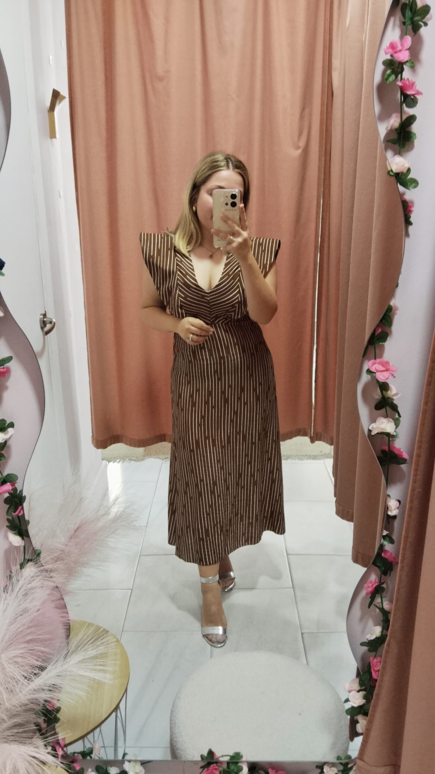 Vestido corte midi – largo en color marrón con estampado de rayas finas blancas. Escote en V y volantes en los hombros. En la parte trasera de la cintura, lleva elástico incorporado, por lo que se adapta perfectamente al cuerpo. Talla única, abarcaría desde la talla S hasta la talla L (36-40).