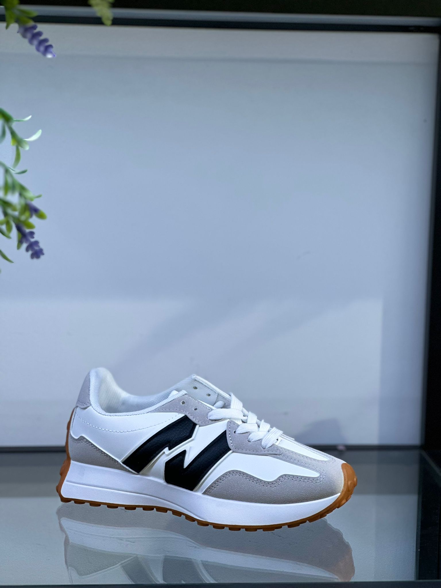 Zapatilla de suela ancha con cordones. Tonos neutros fondo blanco con detalles en negro y gris. Plantilla cómoda. Son ligeras, no pesan mucho y son muy cómodas. Ideales para las largas jornadas o para salir a andar.